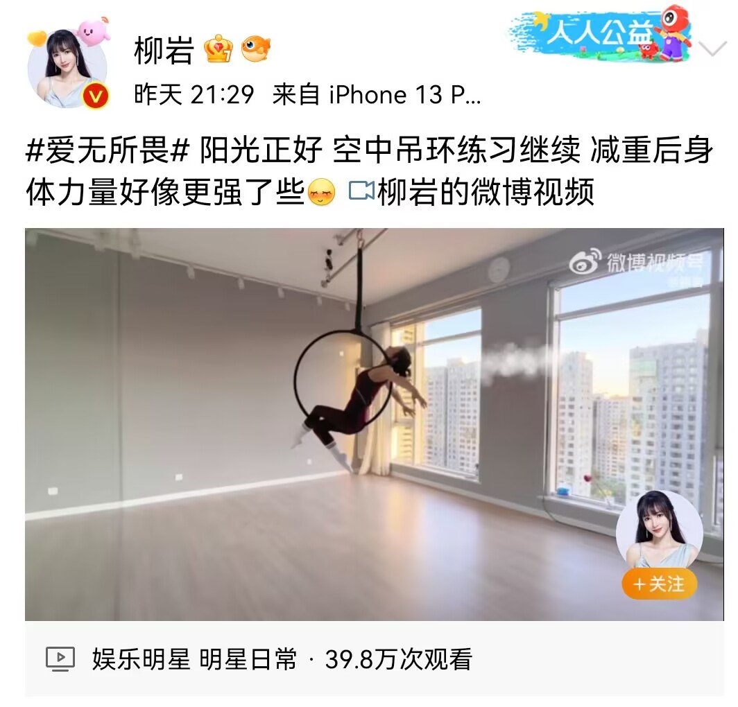 近日,柳岩在个人社交平台上发布自己练习空中吊环的健身视频,并配文:“阳光正好,空中吊环练习继续,减重后身体力量好像更强了些。”视频一经发布,引发许多网友热议。照片中,只见柳岩在一个非常明亮、宽广的训练室里练习空中吊环,动作十分专业。
