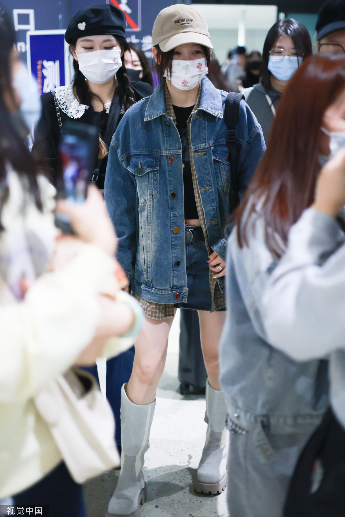 2022年10月24日,上海,徐梦洁现身虹桥机场,身穿牛仔外套搭配长筒靴造型休闲。
