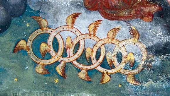 天使的形态是由“火”和“风”构成的,没有具象的肉身。/壁画