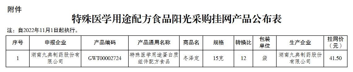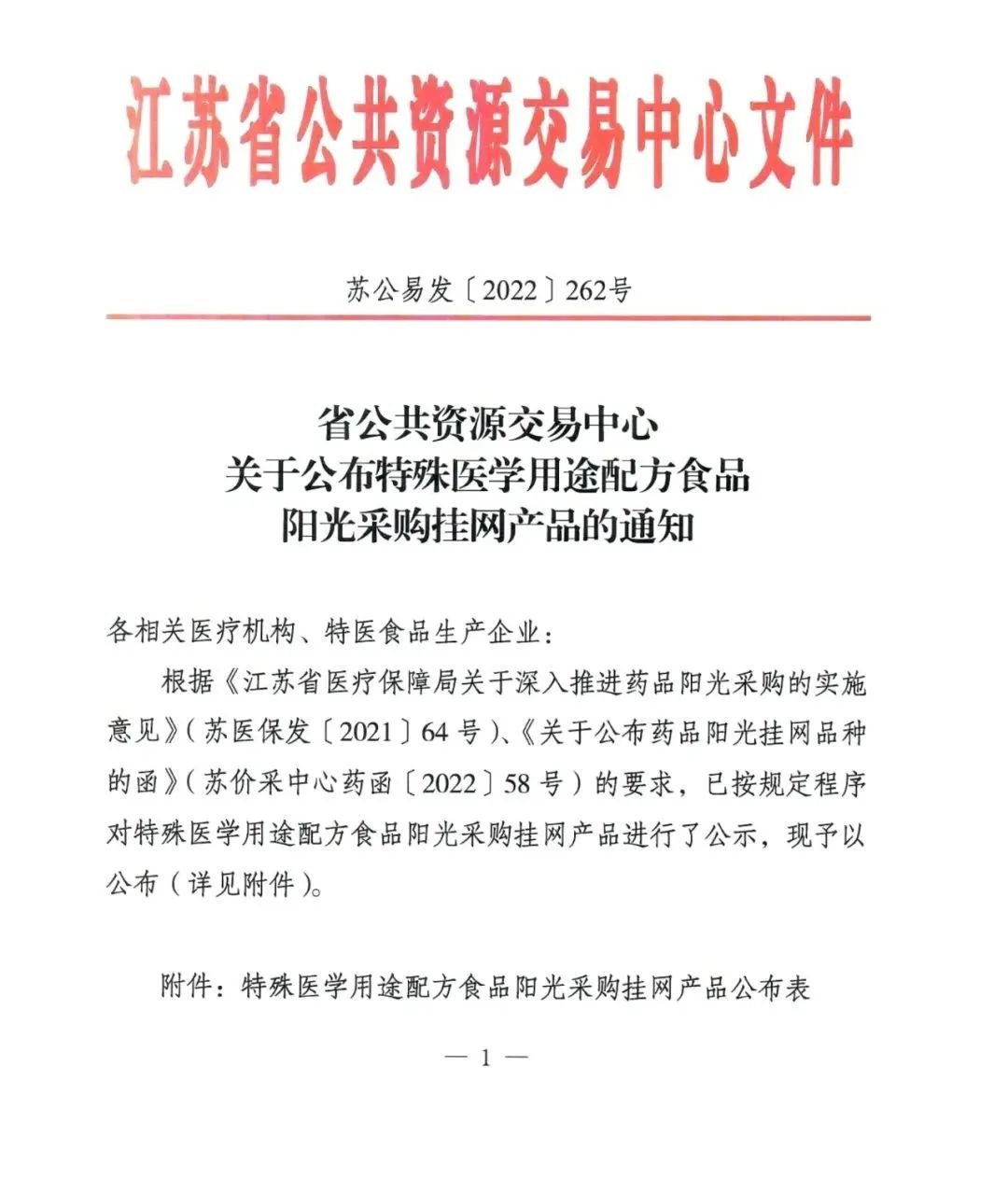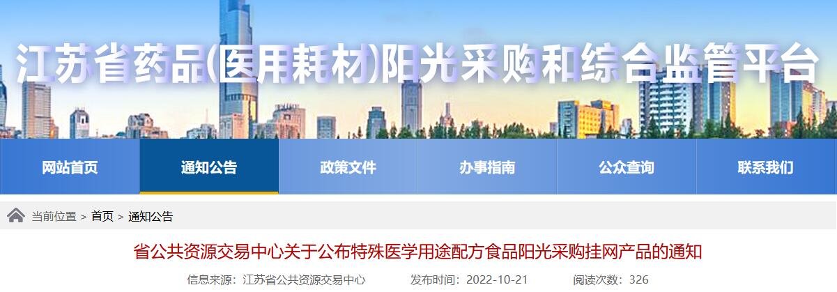 2022年10月21日,江苏省公共资源交易中心发布了关于公布特殊医学用途配方食品阳光采购挂网产品的通知,此次共公布了1款产品,自2022年11月1日起执行。