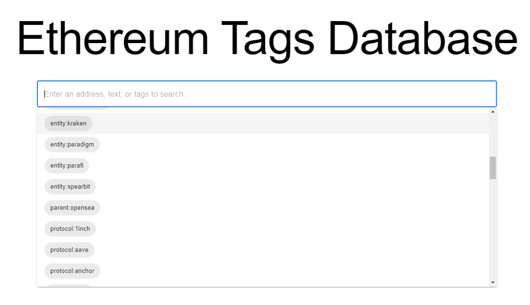 以Ethereum Tags Database为例,这是白帽黑客@samczsun开发的一个以太坊地址标签库。通过这个工具,你不会再遇到想要查某个机构的钱包地址却不知怎么搜索的窘境。输入标签,你会被链接到相关地址。