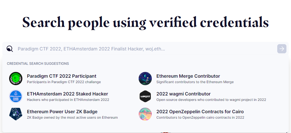 这个搜索引擎可以连接Web3人才和岗位。你可以通过搜索NFT凭证(类似于行为技能标签)找到所有符合条件的地址,也可以在具体的地址中查看他的NFT凭证、其他地址对他的推荐,也可以直接与地址通讯。