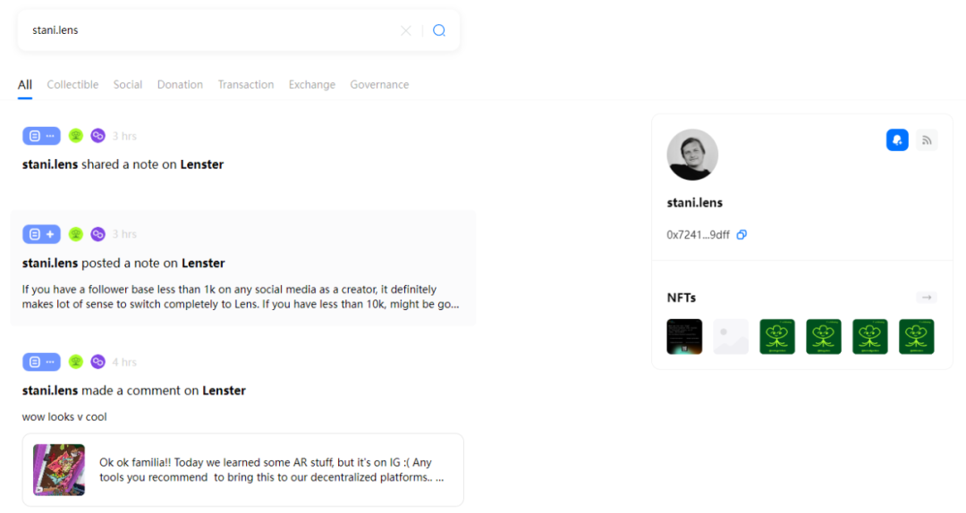 RSS3是一个比较好用的Web3搜索引擎。你在这个平台搜索stani.lens,可以查到Stani的所有藏品,社交、捐赠、治理及交易记录。并且信息都是以易读的方式呈现。