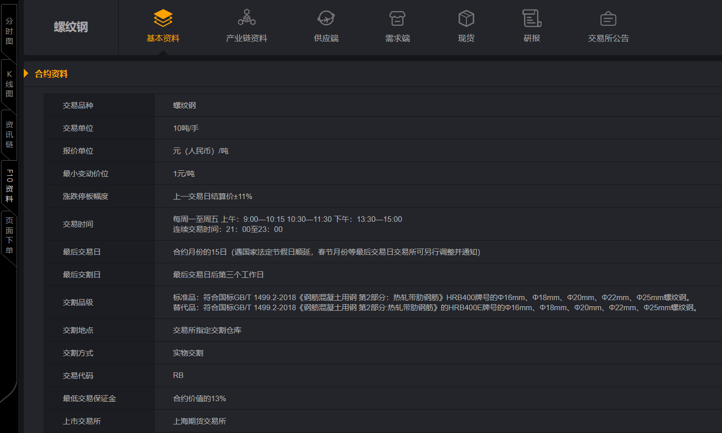例如查询螺纹钢的交易单位,这个交易单位一般在电脑交易软件的F10按钮中可以查询到,或者手机交易APP也有个F10的入口处可以查询到;或者在交易所官网找到具体品种的合约文本也可以看到。