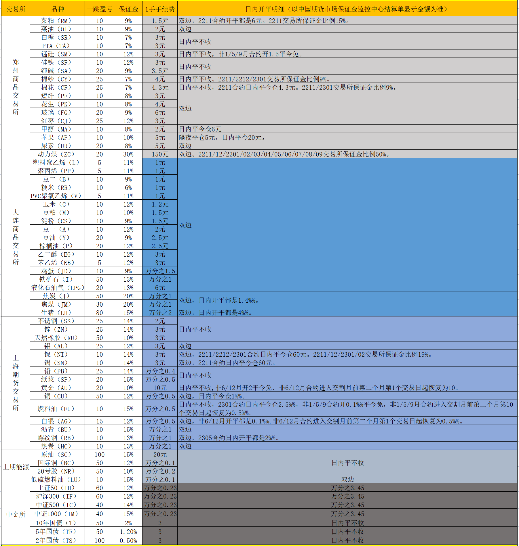 下图就是2022年最近的交易所具体收取标准-各期货品种保证金标准一览表: