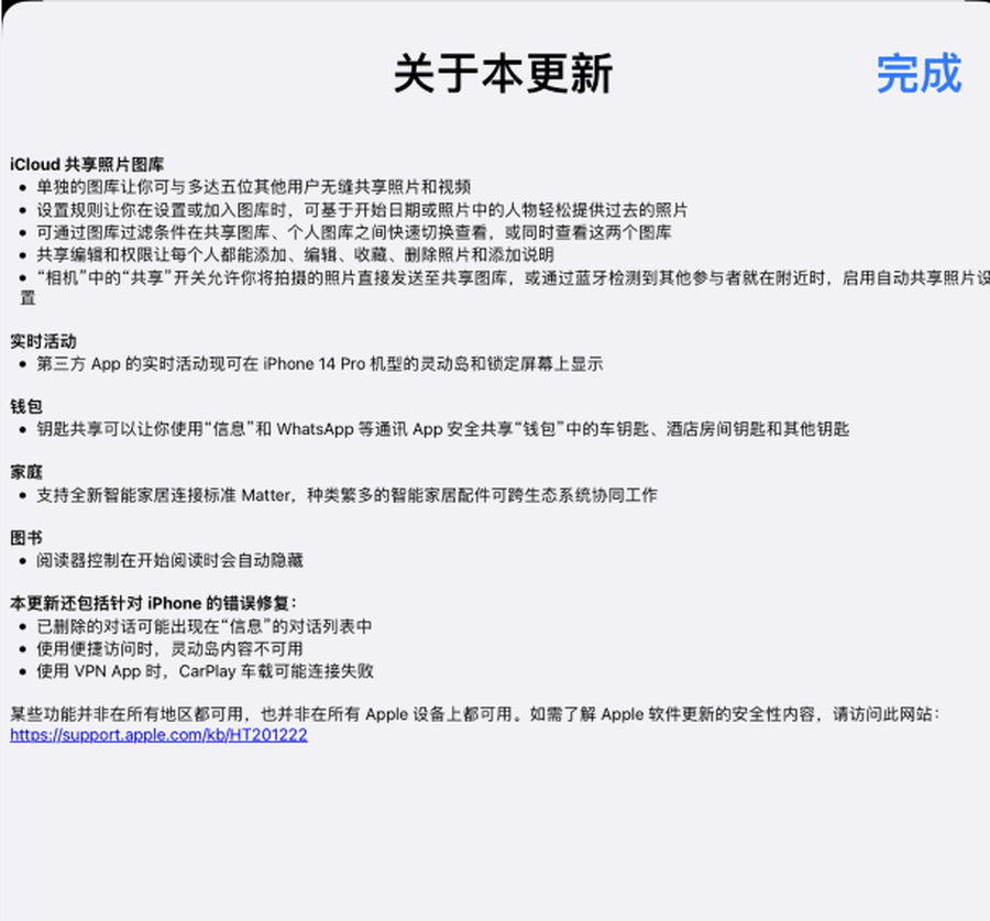 iOS 16.1 正式版推出 iCloud 共享照片图库,轻轻松松可让家人照片保持最 新状态。本更新还在实时活动中加入了对第三方 App 的支持,并包括针对 iPhone 的其他功能和错误修复。