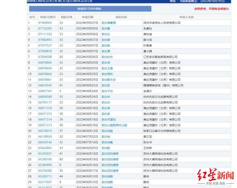 红星新闻记者随后了解发现,法律并未明文禁止历史名人姓名用作商标注册。在全国各地,很多历史名人都被抢注了商标,仅与“李白”相关商标申请,就检索出共1258件。