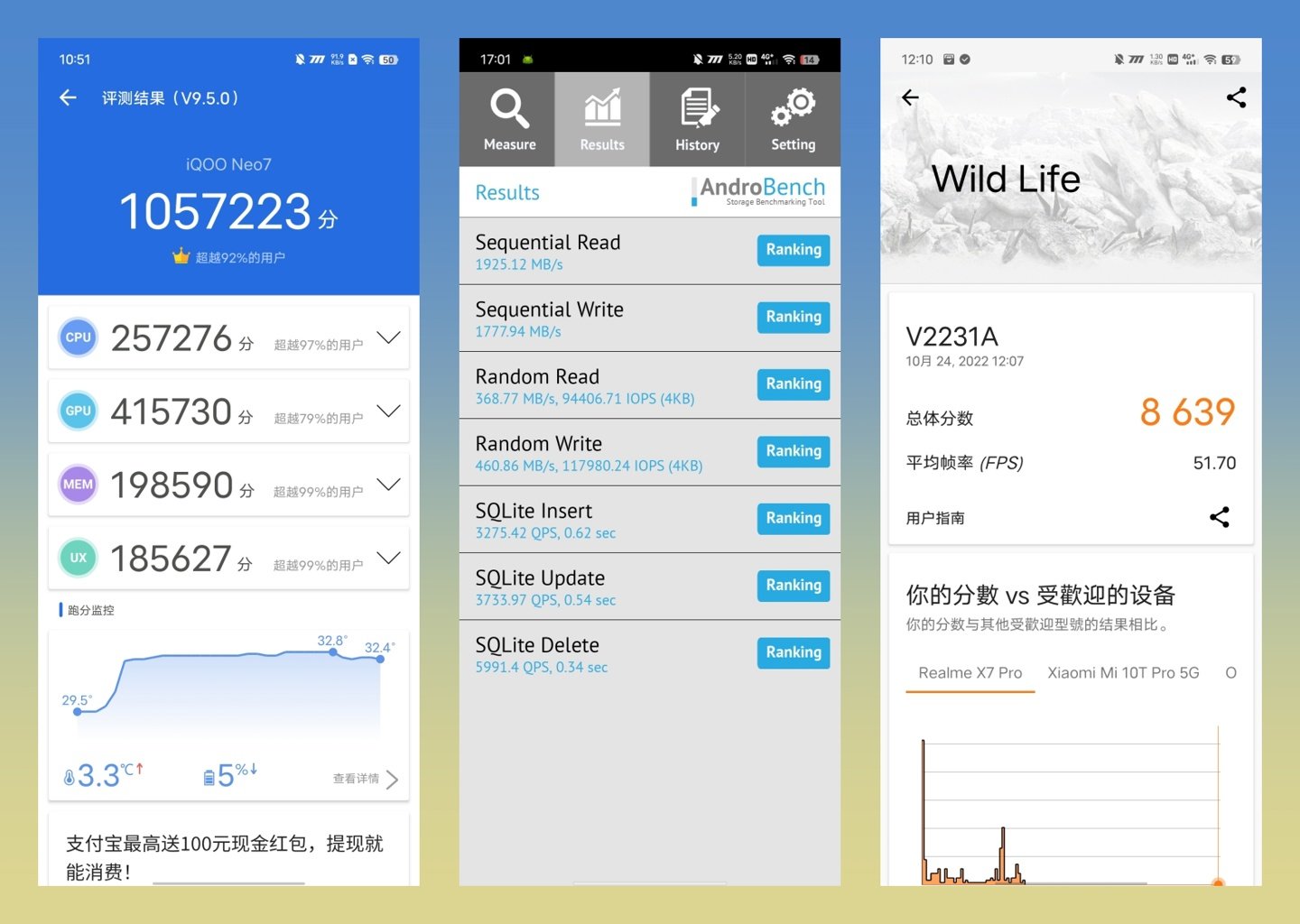从配置来看,iQOO Neo7 是妥妥的 2022 年旗舰机规格,下面我们来看一下 iQOO Neo7 的跑分成绩。