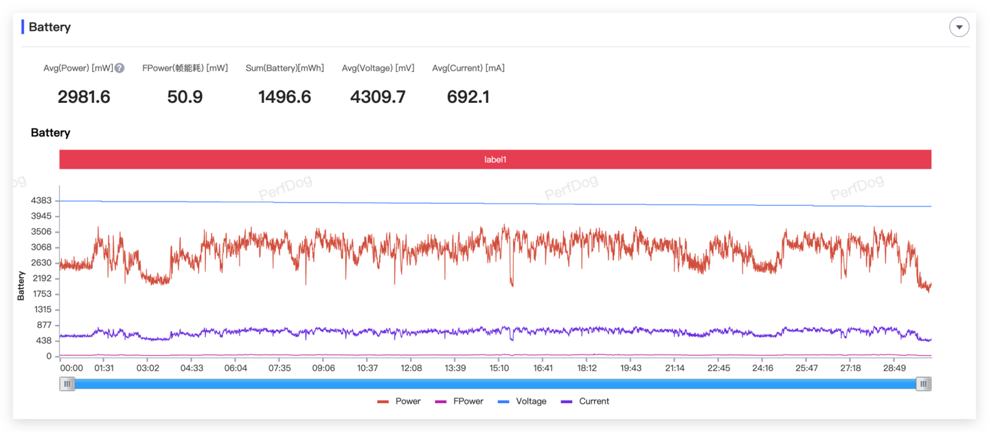 在《原神》游戏中,iQOO Neo7 达到了 5.96W(双电芯:2981mW*2),帧能耗为 101.8mW,这个表现,同样要远优于骁龙 8 旗舰机(基本都在 6W、甚至 7W 之上);和骁龙 8 + 的整体表现相似。