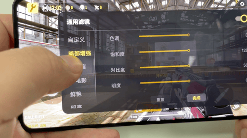 iQOO Neo7 的游戏视觉增强加入了很多种模式,以《使命召唤手游》为例,除了“视觉调优”之外,还额外加入了诸如暗部增强、防雪盲、老电影、鲜艳、明亮以及自定义等模式的通用滤镜,用户可以根据自己需求,自行选择或自定义设置,妥妥一“物理外挂”。