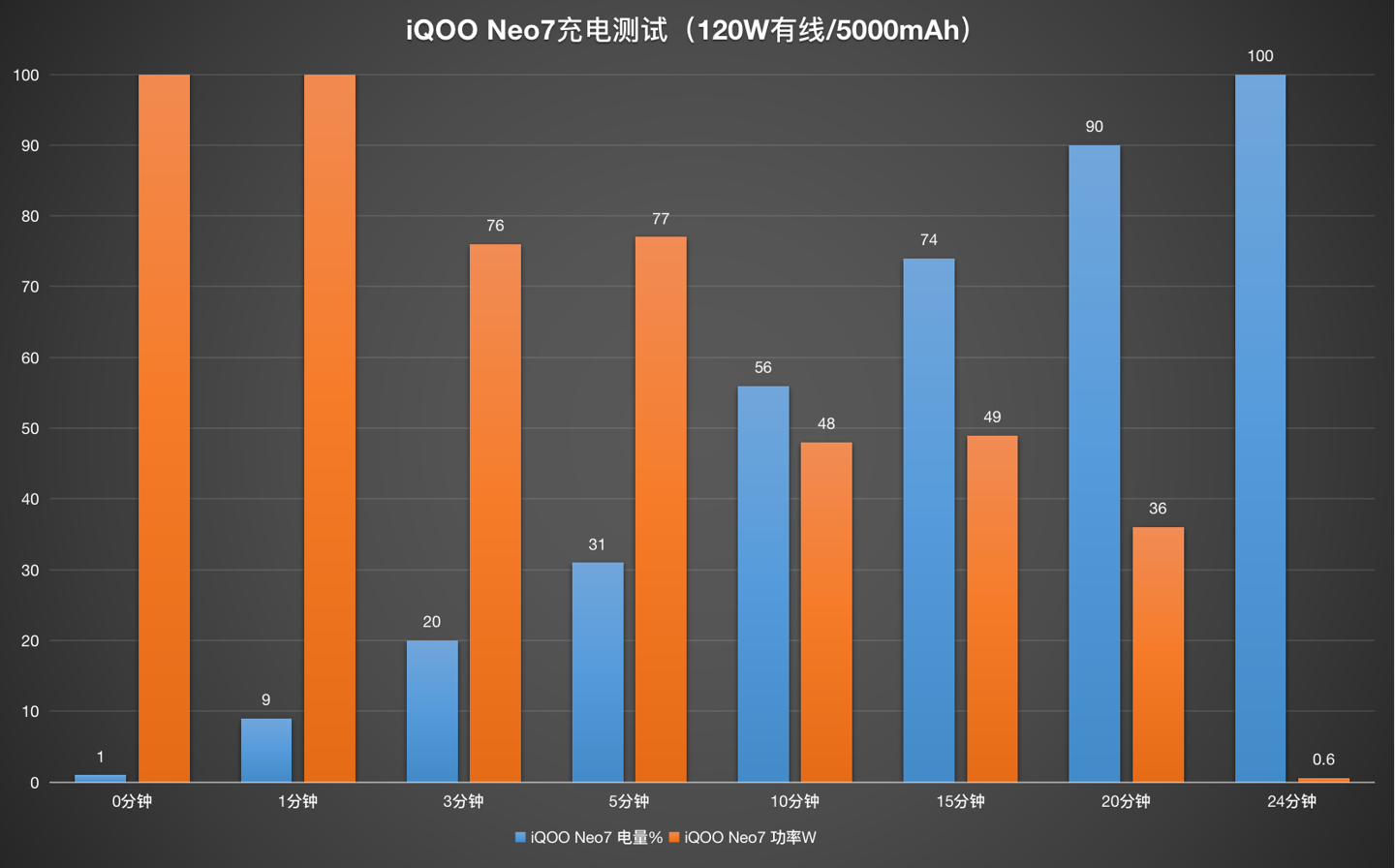 iQOO Neo7 从 1% 至完全充满,只需要 24 分钟左右,甚至比官方宣称的 25 分钟还要快一些。并且,充至 100% 后,没几秒就提示已经系统充电已完成,由此可见涓流时间极短,UI 显示 100% 没有丝毫的水分。
