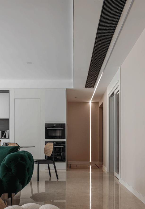 客厅装修吊顶是二次安装,全屋都进行了无主灯设计,与餐厅灯明显不同类型的感受,使得空间简约之余不单调,光源遍布也更加均匀,每一个角落都可以被点亮。