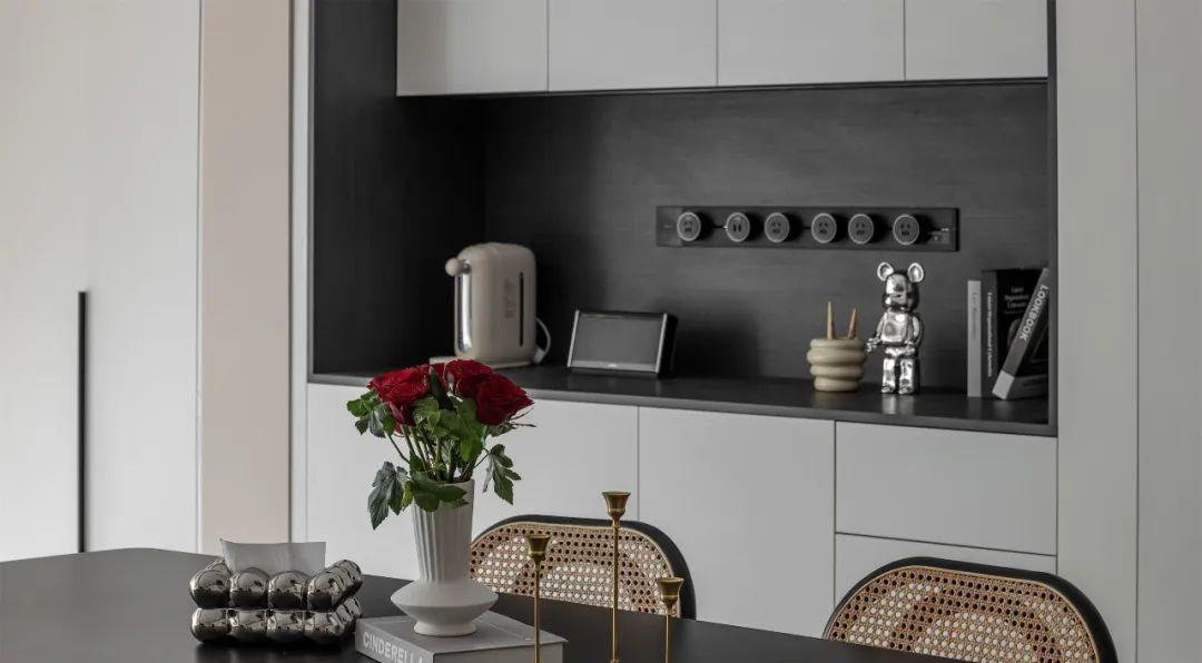 餐厅柜下方的壁柜特意向内进行了15cm,防止取放物品时磕磕碰碰停止。