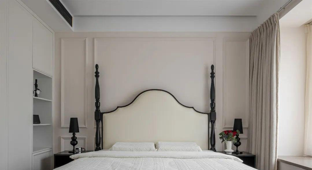主卧相比动区,主要基于睡眠质量氛围和收纳整理空间而进行的设计,不需要太多装饰设计,但气氛感一定必不可少。简洁的黑与白色彩搭配石膏线组成简约无失格调的睡眠质量空间,在遮阳窗帘和光源柔和复古时尚床头台灯的气氛塑造下,营造出宁静致远的氛围感。