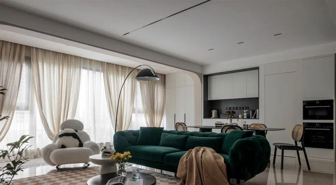 当阳台的空间被列入进客厅后,传统遮阳窗帘私密性是保障了,但却白白浪费大落地窗的美好景色。在经历多稿设计策略的修改后,呈现出来的效果也是令人十分震撼,窗纱若隐若现的独特美感,搭配拱形门洞浪漫气氛感一瞬间打满。