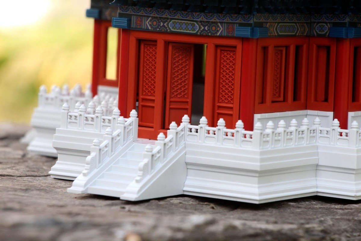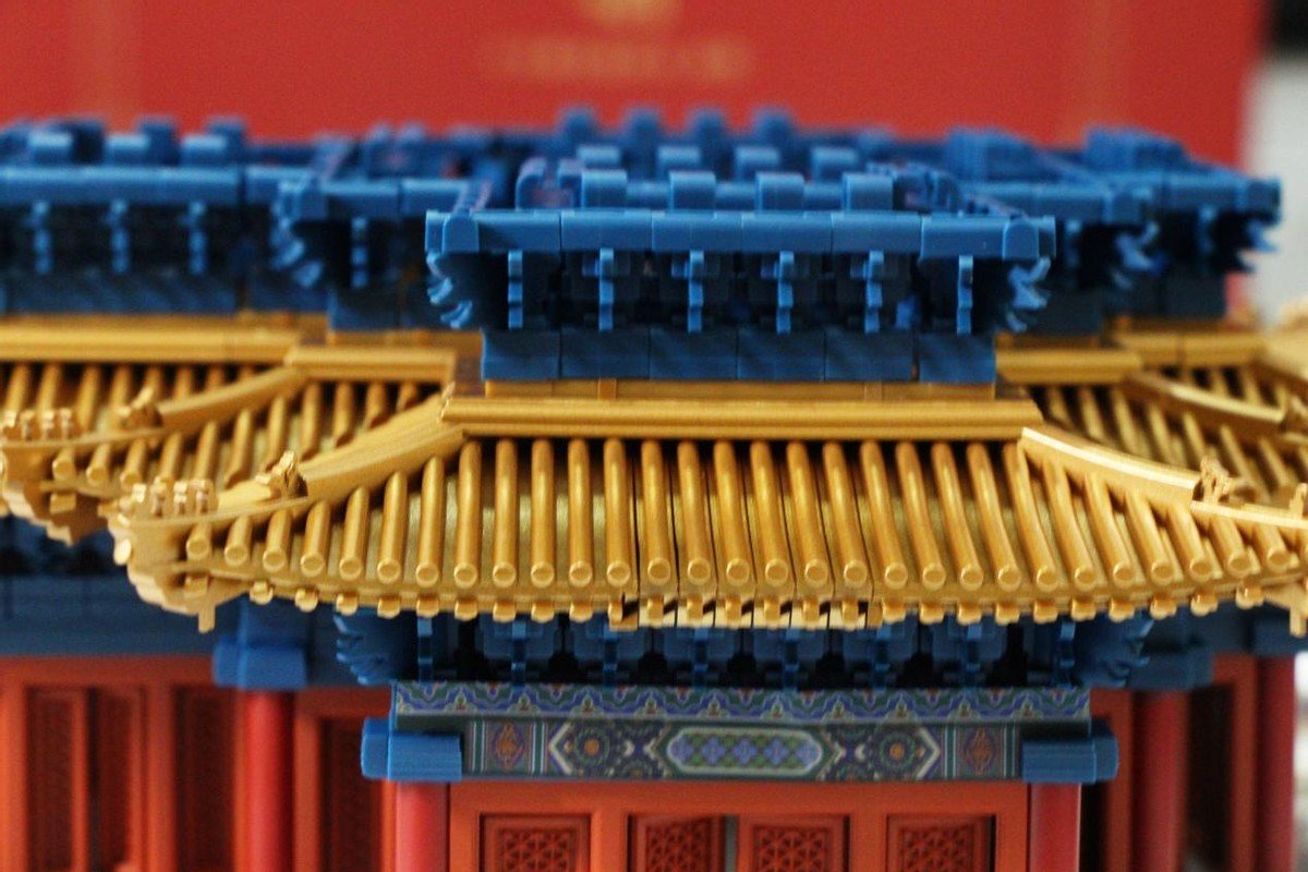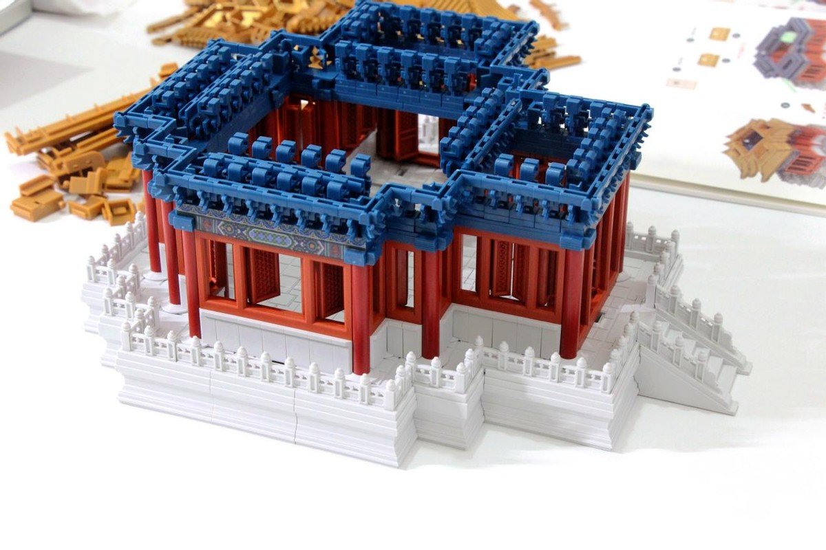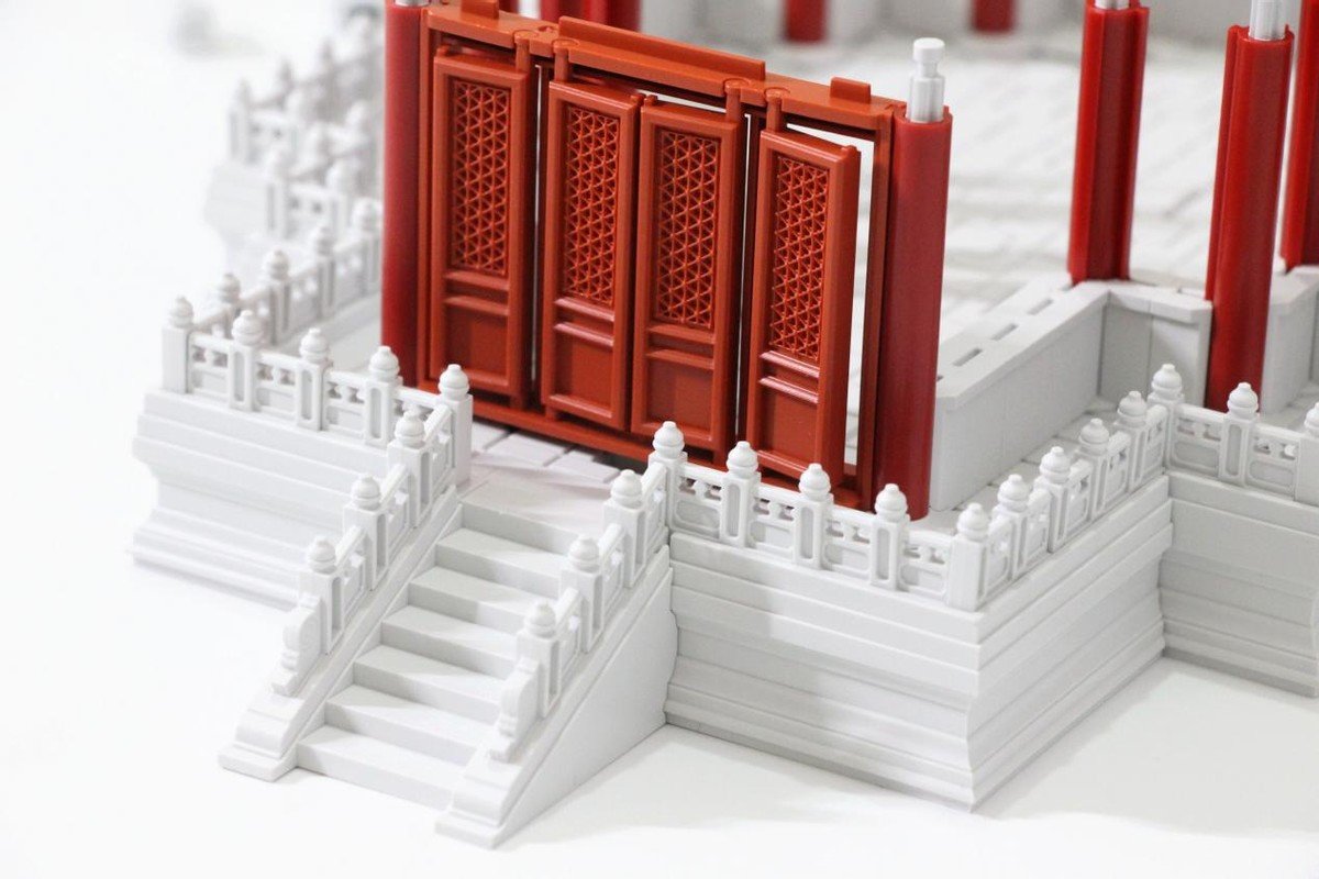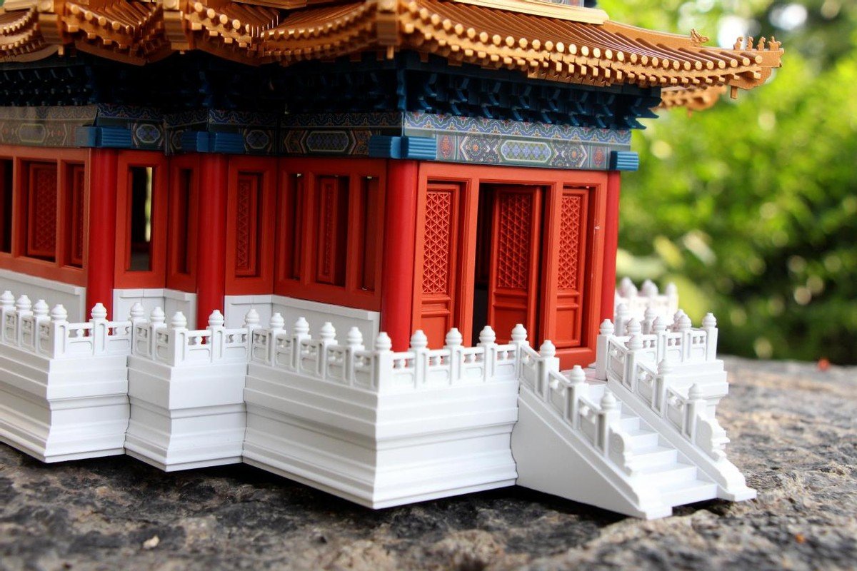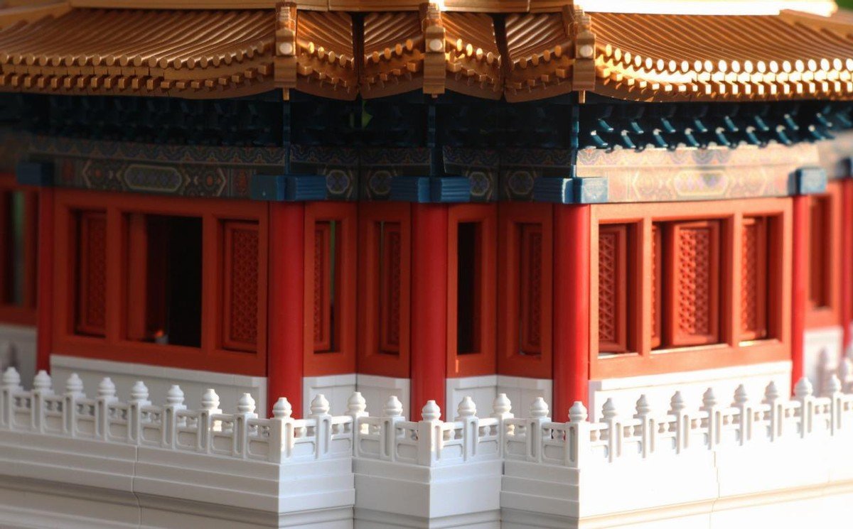 在拼搭过程中能够看出在色彩的还原度及搭配上也是与真正的角楼一样,汉白玉白色,朱红,青绿,很别致的搭配。这一层是斗拱的设计,角科斗拱和五踩斗拱,再搭配额枋的设计,细节一一展现,完美还原传统设计。