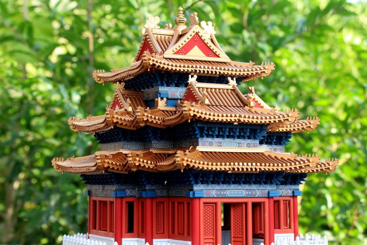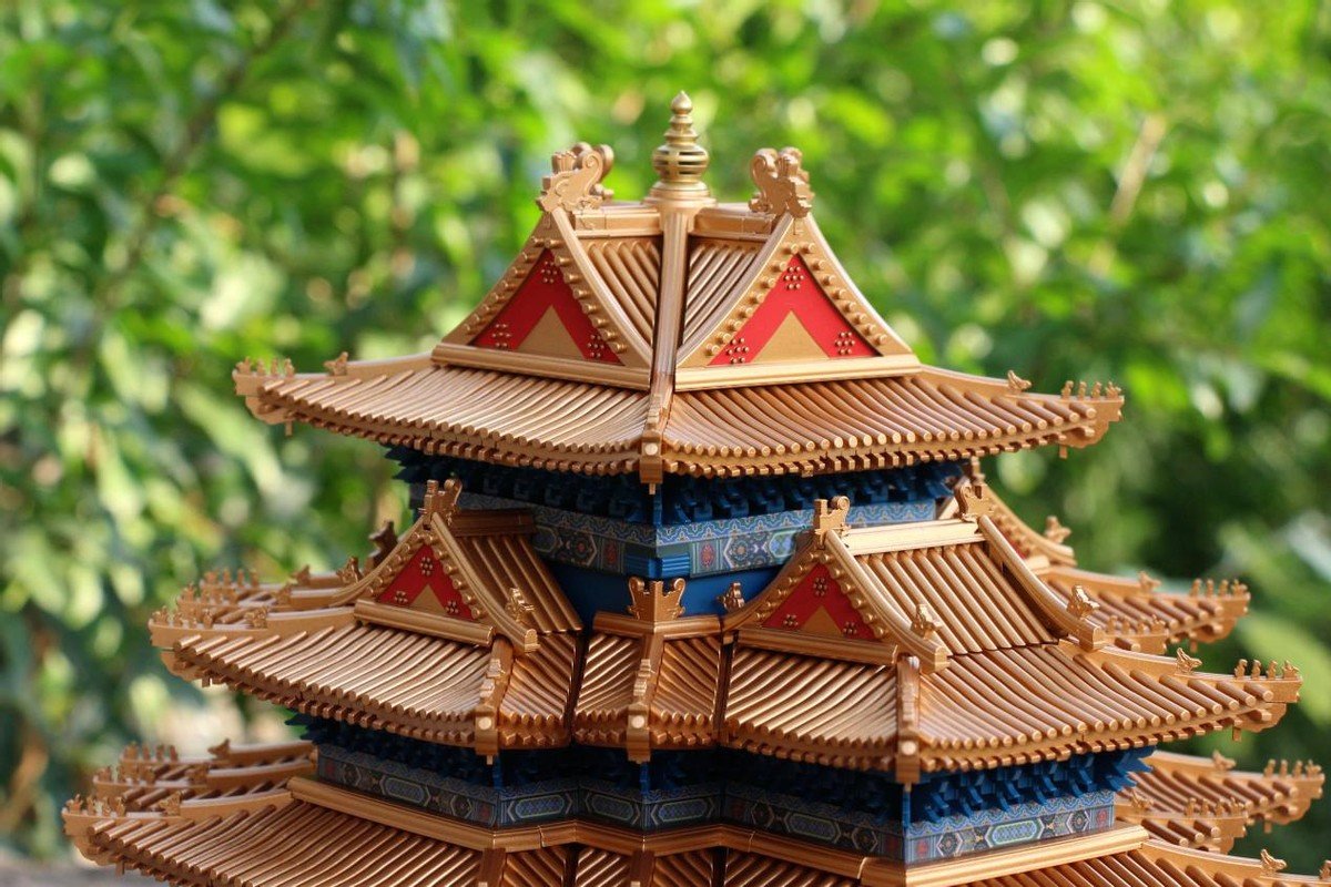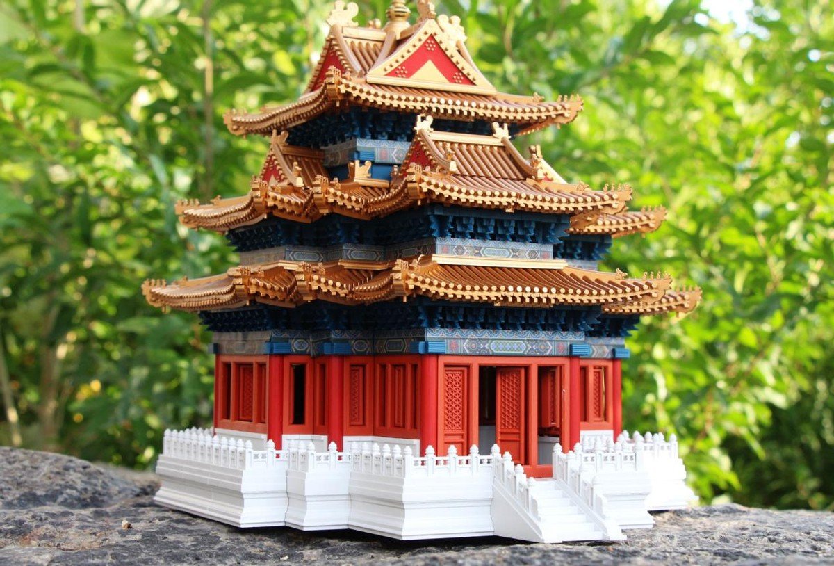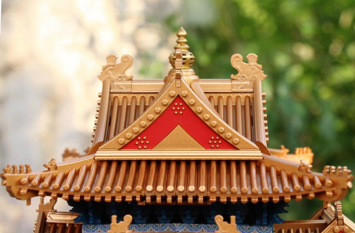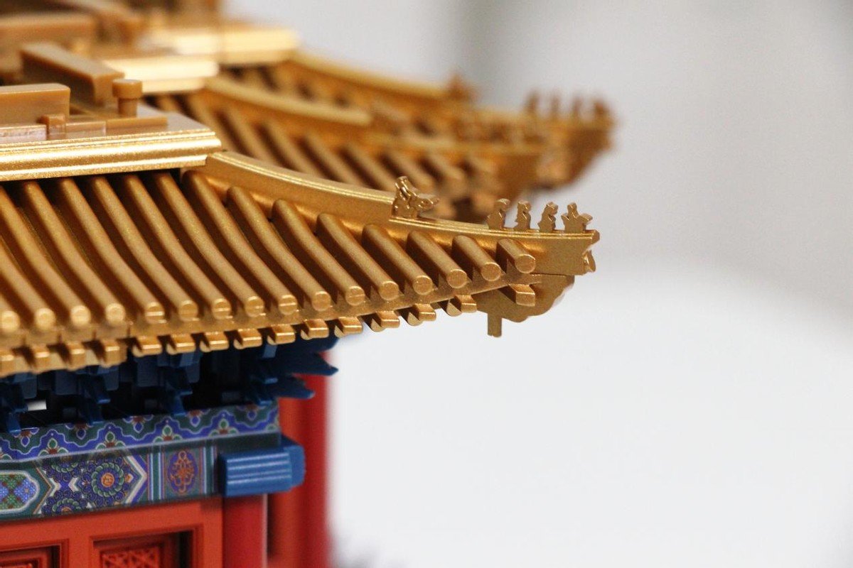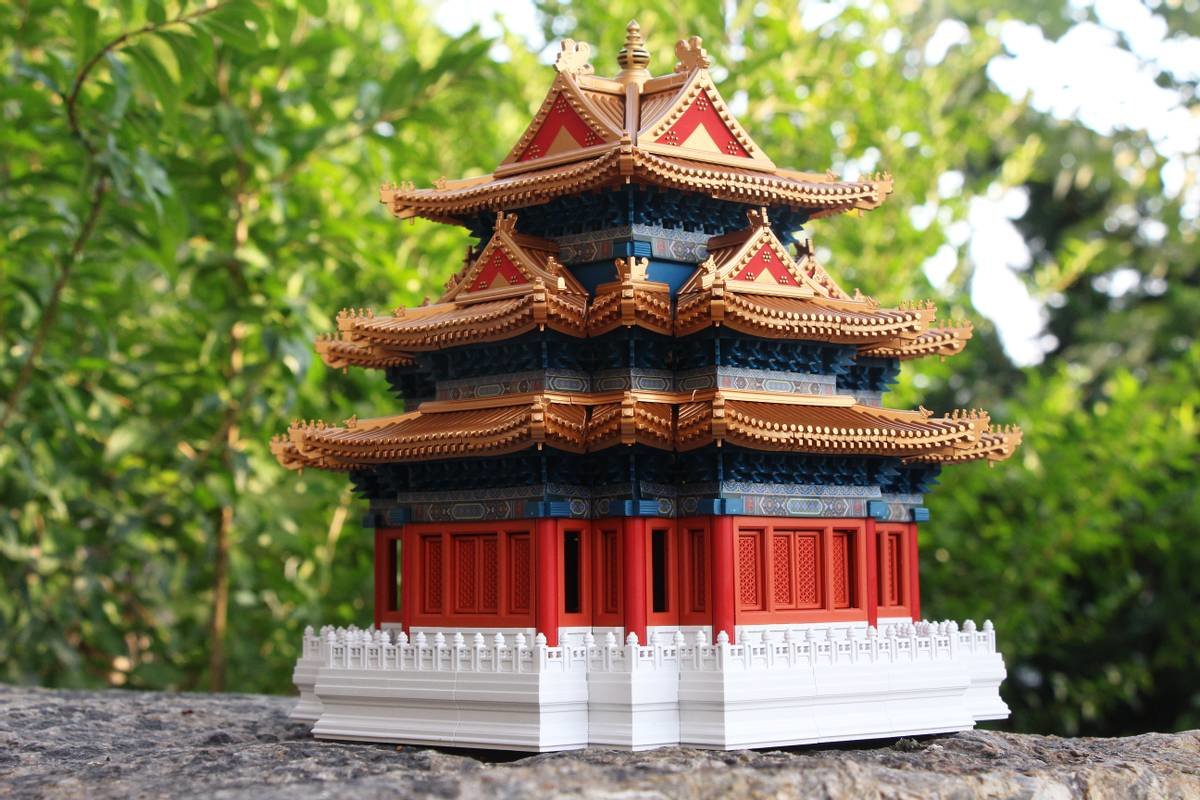三层以及顶部的拼装就更为容易,鎏金宝顶+十字脊歇山屋顶,就完成了整个角楼的搭建,在搭建过程中比较重要的就是贴纸搭配要按照说明,搭建一层贴一层,否则后续会很难着手贴纸的。