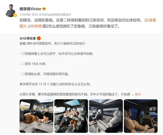 其中一张图片显示,第二排座椅调至最后有着超大腿部空间,而该图片信息立刻引来了理想汽车CEO李想的质疑。李想评论:“图2怎么感觉蹲在了后备箱,三排座椅好像没了。”