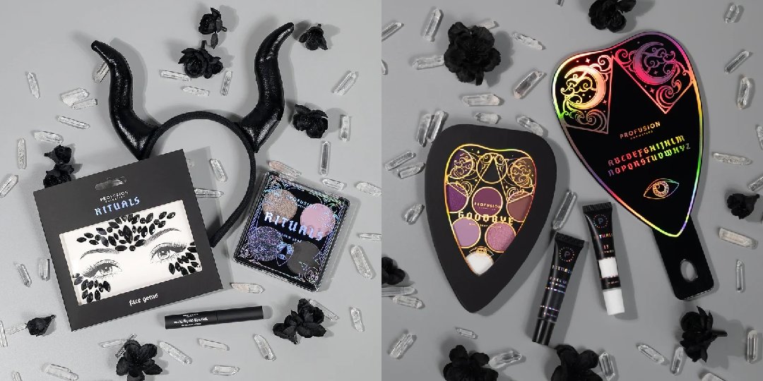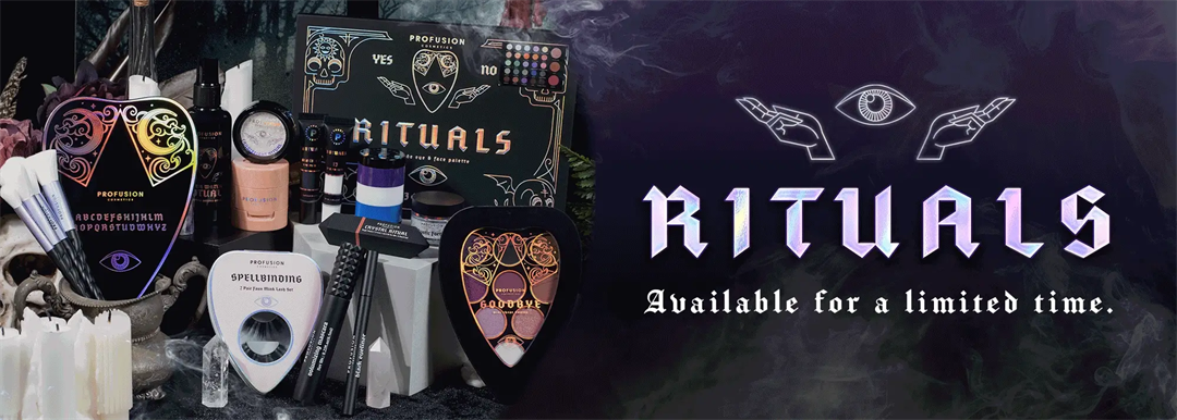 美妆品牌Profusion Cosmetics在今年万圣节以通灵板和巫术为灵感推出了Rituals Halloween Collection的新系列,产品包括了眼影盘、睫毛膏、眼线笔、假睫毛、唇膏、腮红、妆前乳、定型喷雾等数十样。