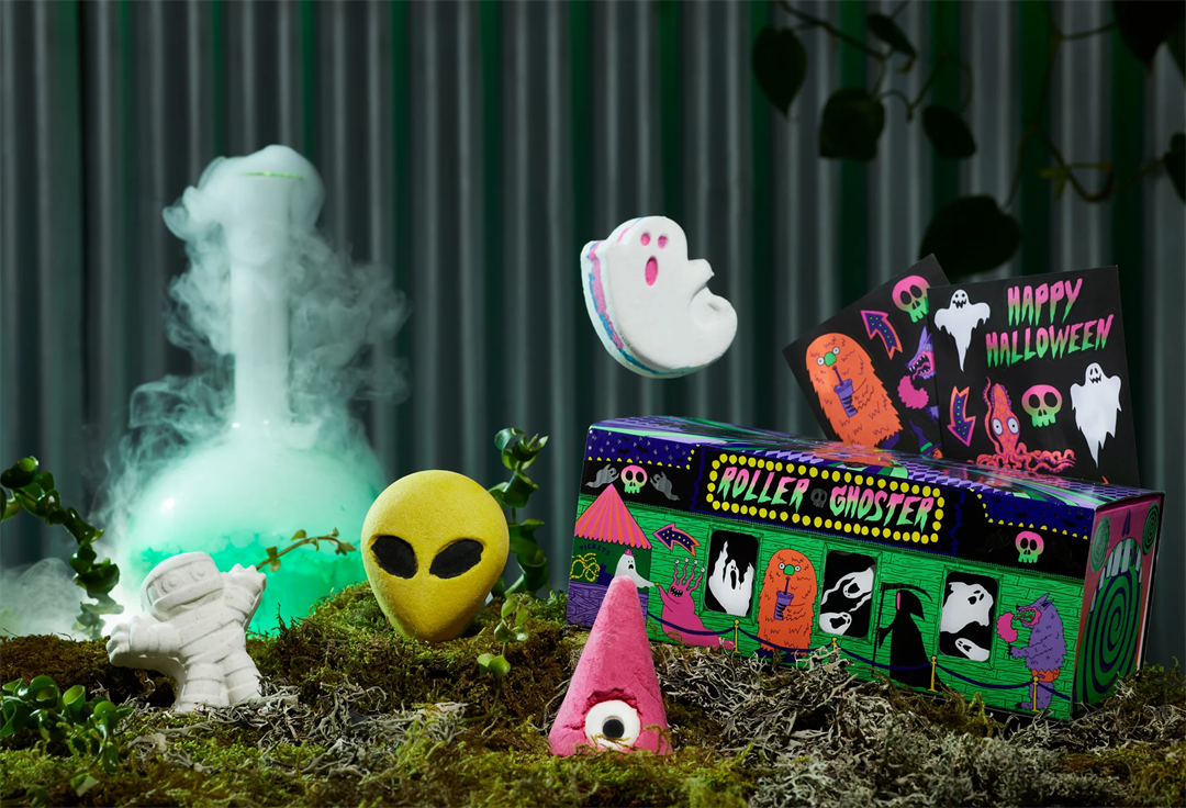 限定产品包括了以尖叫的鬼魂、蝙蝠、南瓜、大脚怪、外星人、飞碟等造型的沐浴炸弹以及幽灵造型的肥皂、狼蛛造型的果冻沐浴露、蝙蝠造型的果冻身体磨砂等。