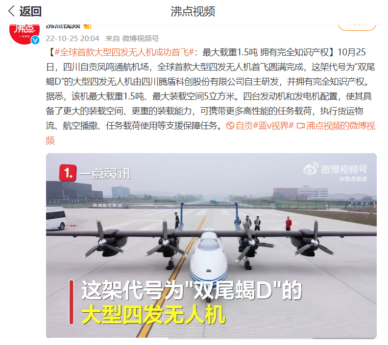 IT之家 10 月 25 日消息,据沸点视频报道,10 月 25 日,四川自贡凤鸣通航机场,全球首款大型四发无人机首飞圆满完成,这架代号为“双尾蝎 D”的大型四发无人机由四川腾盾科创股份有限公司自主研发,并拥有完全知识产权。