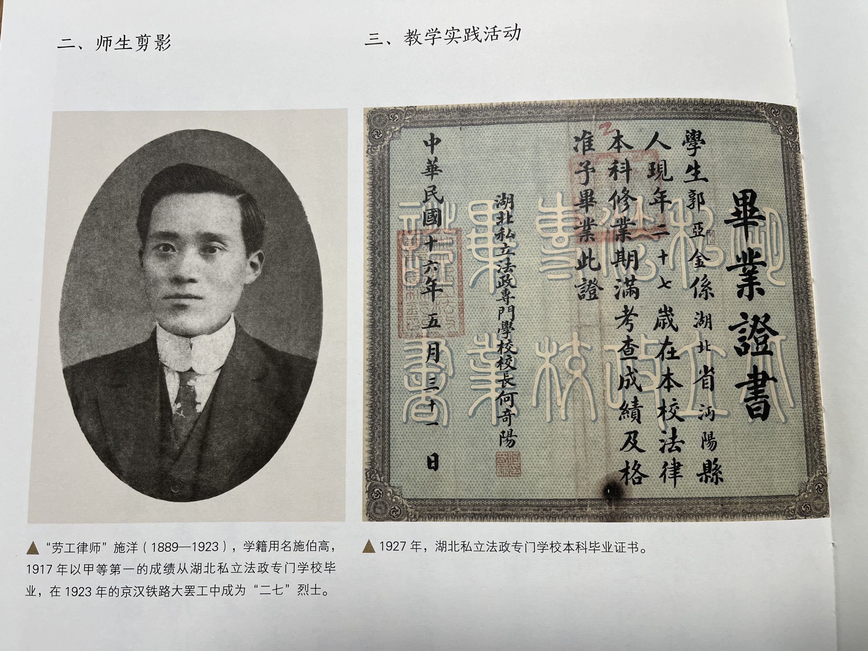 书中中共早期党员何羽道任教湖北省公立法政专门学校时的照片档案。何羽道1927年曾任武昌中央农民运动讲习所教员、武汉市政委员会委员。他大革命后加入中国共产党,后被捕,1928年初在武汉就义。湖北省公立法政专门学校1924年改名湖北省立法科大学,1926年10月并入武昌中山大学,成为后来成立的武汉大学法学院的前身。