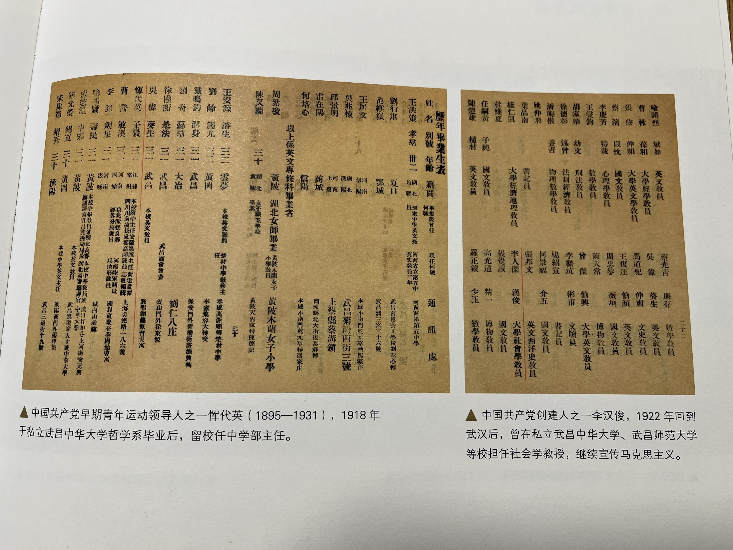 记者在书中还看到一些武汉地区早期共产党员的档案资料。中国共产党早期青年运动著名领导人恽代英,1918年毕业于私立武昌中华大学哲学系,后留校任中学部主任。书中收录有该校“历年毕业生表”档案,表中可以找到恽代英的个人信息。中国共产党创建人之一李汉俊,1922年回到武汉后,曾在私立武昌中华大学担任社会学教授,后到武昌高等师范学校教授社会学,继续宣传马克思主义,书中有李汉俊作为私立武昌中华大学教师的个人信息档案,也有他作为武昌高等师范学校教师的照片档案。