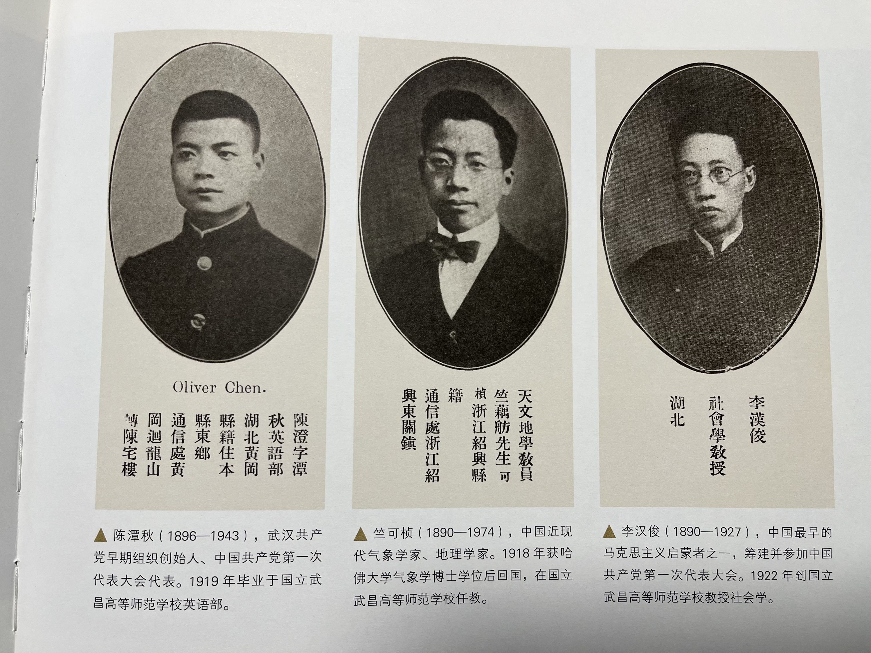 记者阅读此书看到,武汉地区共产党早期组织创始人、中共一大代表陈潭秋1919年毕业于武昌高等师范学校英语部的学生装照片档案,照片下面写有繁体的“陈澄字潭秋,英语部,湖北黄冈县籍,住本县东乡,通信处黄冈回龙山转陈宅楼”。陈潭秋就读的武昌高等师范学校在1923年后先后改组为武昌师范大学、武昌大学,1926年底与武汉多所高校合并为武昌中山大学,1928年7月武昌中山大学改组为武汉大学。