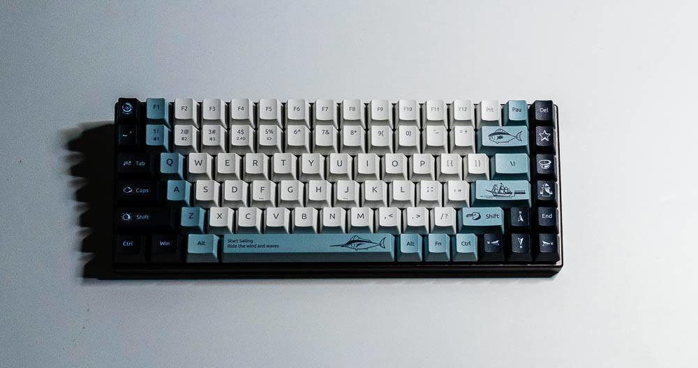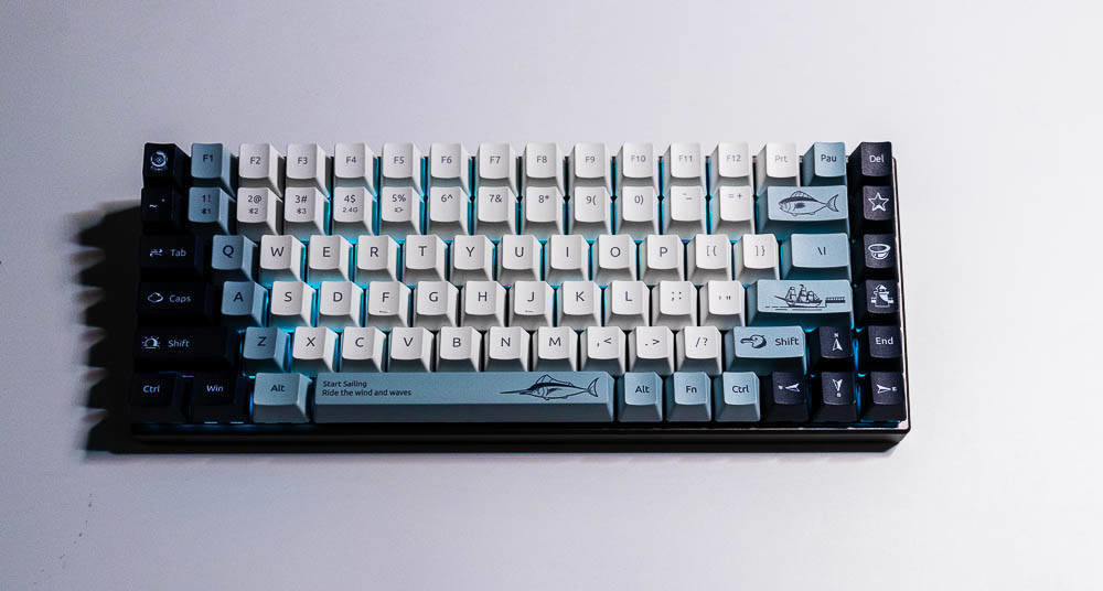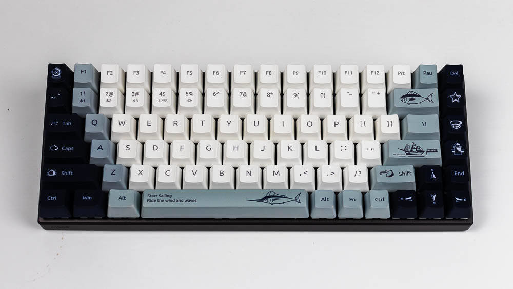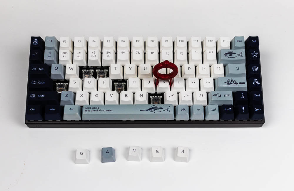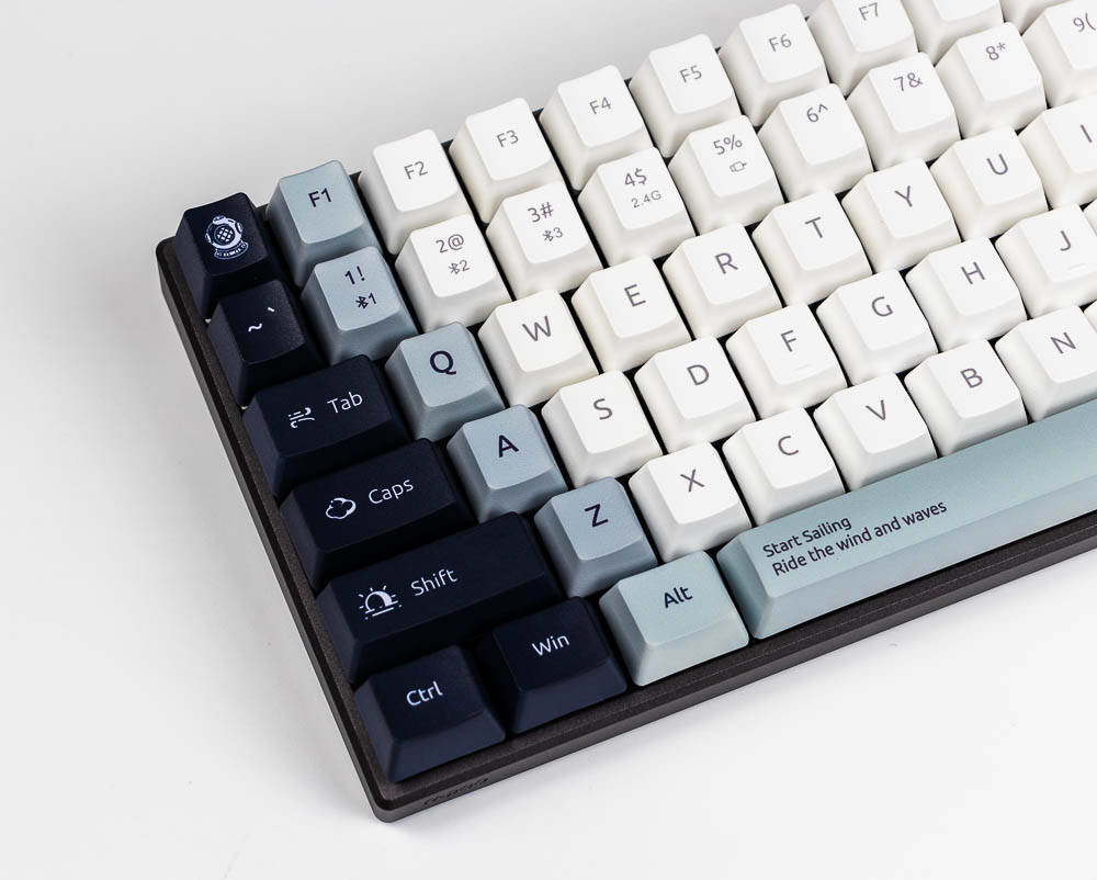 航海日记的创意,让你感受到海风吹起了风范,不仅有诗和远方,我们还可以一起去远航,开拓属于自己的独家记忆,向着蔚蓝的深处,吹响悠扬的号角,与海洋生物一起,踏浪前行,敲响航海物语湛蓝色的篇章。所以,你在航海日记版,能看到灯塔、北极星,船,箭鱼,海鸟和潜水头盔等等,具有很浓的海洋气息,键盘采用白色,深蓝色,浅蓝灰色这三种配色,如果你观察仔细,你会发现其实色彩的布局是不一样的,前者的F5-F8是深色,而航海日记却采用了浅色,前面的键盘ESC和空格键、回车键采用的是很凸显的颜色,而航海日记的浅灰蓝色则是深色和浅色之间逐渐过渡,围绕着浅色,是一圈浅灰蓝色,然后两侧是深色,ESC是深色,空格和回车则是浅灰蓝色,所以虽然都是色彩定制版本,但是还是有差别的,雷柏MT510PRO机械键盘航海日记版多了更多的绘制,色彩过渡也不同。没有拿到喵萌假期,但那款则更是卡通化,更萌,色彩对比也没航海日记强烈。
