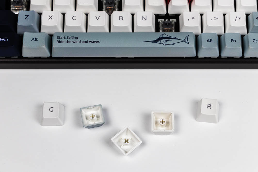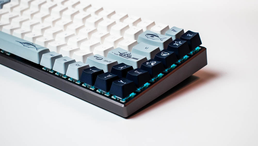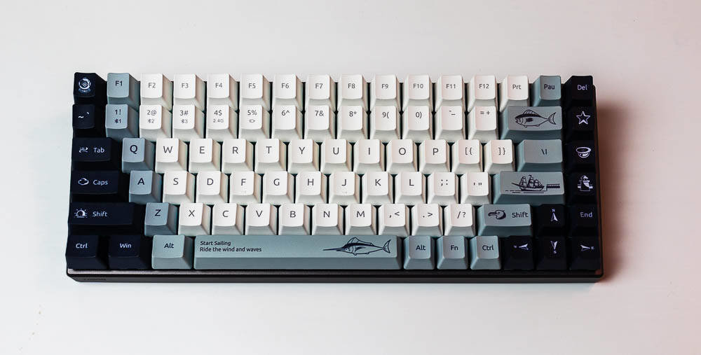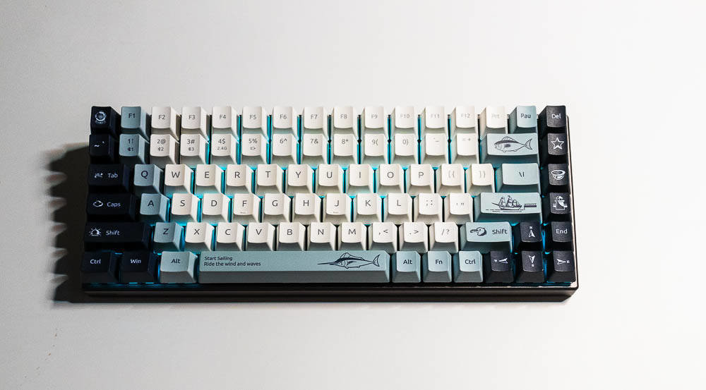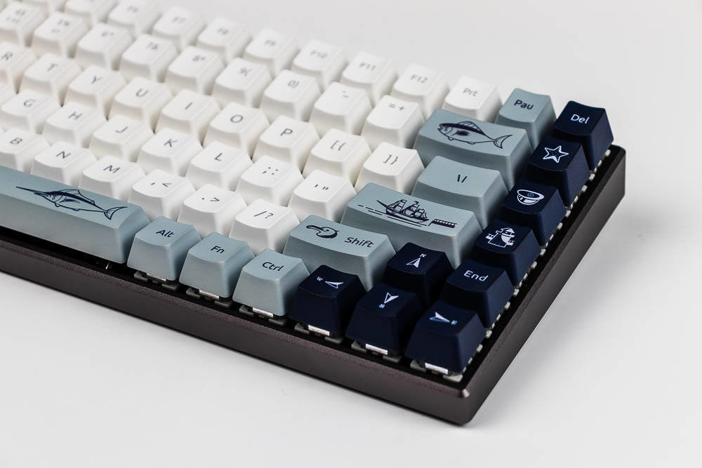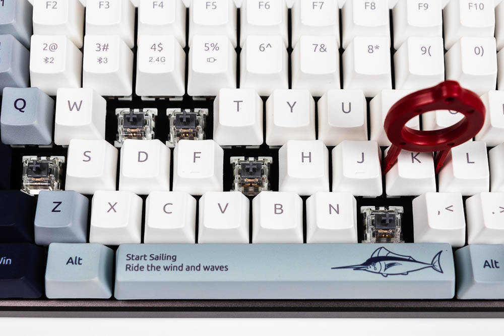 航海日记的创意,让你感受到海风吹起了风范,不仅有诗和远方,我们还可以一起去远航,开拓属于自己的独家记忆,向着蔚蓝的深处,吹响悠扬的号角,与海洋生物一起,踏浪前行,敲响航海物语湛蓝色的篇章。所以,你在航海日记版,能看到灯塔、北极星,船,箭鱼,海鸟和潜水头盔等等,具有很浓的海洋气息,键盘采用白色,深蓝色,浅蓝灰色这三种配色,如果你观察仔细,你会发现其实色彩的布局是不一样的,前者的F5-F8是深色,而航海日记却采用了浅色,前面的键盘ESC和空格键、回车键采用的是很凸显的颜色,而航海日记的浅灰蓝色则是深色和浅色之间逐渐过渡,围绕着浅色,是一圈浅灰蓝色,然后两侧是深色,ESC是深色,空格和回车则是浅灰蓝色,所以虽然都是色彩定制版本,但是还是有差别的,雷柏MT510PRO机械键盘航海日记版多了更多的绘制,色彩过渡也不同。没有拿到喵萌假期,但那款则更是卡通化,更萌,色彩对比也没航海日记强烈。