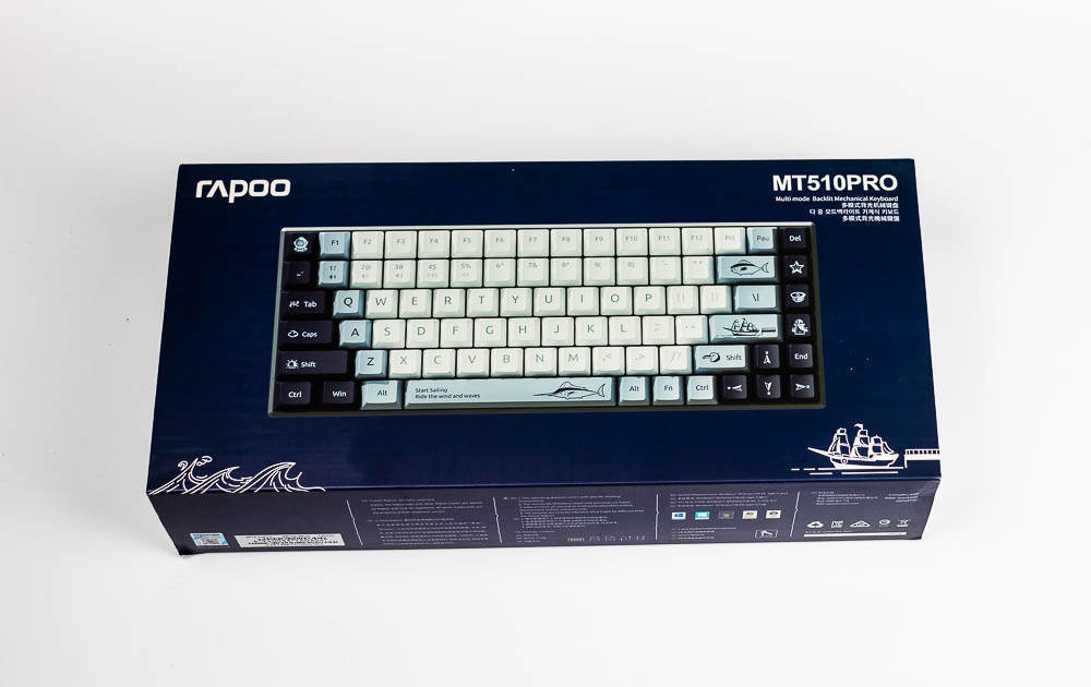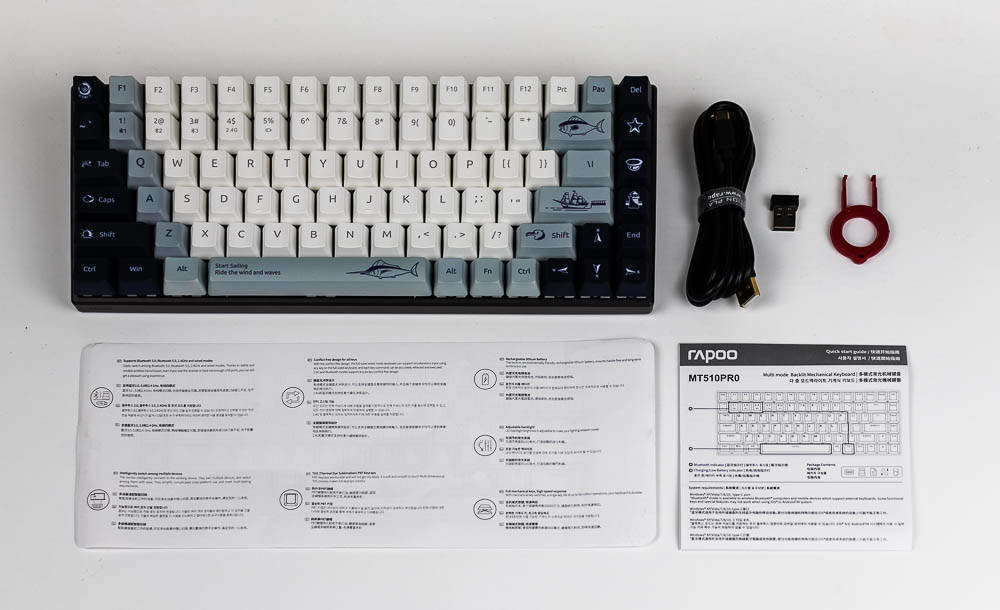 拆开包装,雷柏MT510PRO机械键盘航海日记版与V700-8A的组件一样,主要有雷柏MT510PRO多模背光游戏机械键盘1个,拔键器1个,Type C接口的USB数据(充电)线1根,无线2.4G接收器1个,及快速使用指南1本。
