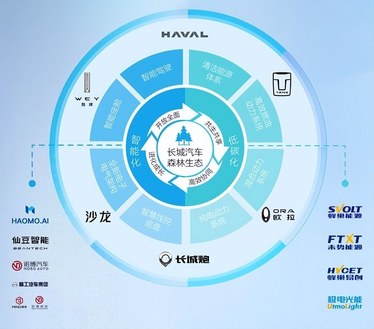 但老话说得好“文无第一武无第二”,这么多企业开始在智能化、新能源等领域布局,哪家车企才最全面,且最有成效的呢?未来不好说,但从目前的态势来看,长城汽车森林生态就遥遥领先于同行。