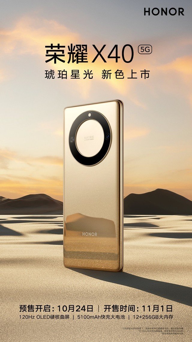 中关村在线消息:10月27日,据荣耀官方爆料,荣耀又为刚刚发布的X40添加了一款全新的配色,新配色以琥珀星光命名,属于秋季配色,新配色以琥珀金打底,叠加闪光砂纹理,呈现梦幻美感。