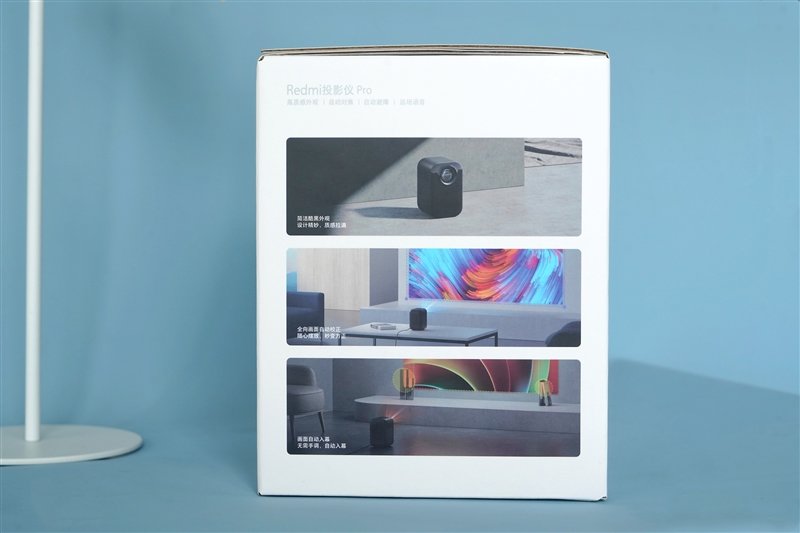 Redmi投影仪Pro外包装的正面和侧面,还是非常简约的,主要介绍了支持自动入幕、自动对焦、自动校、自动避障等功能。