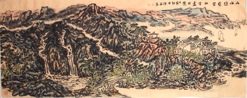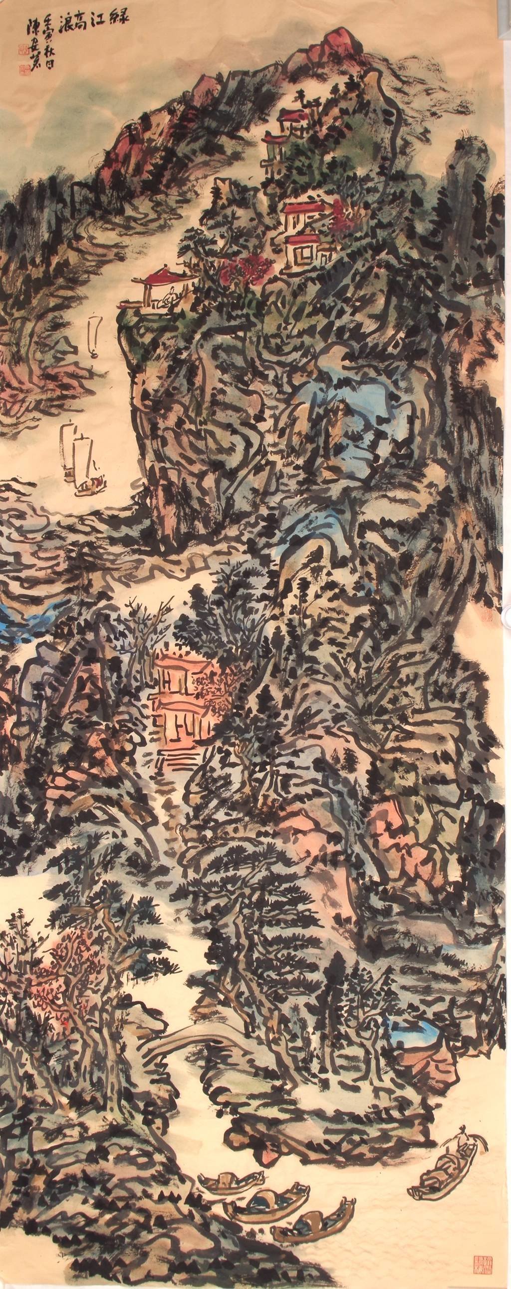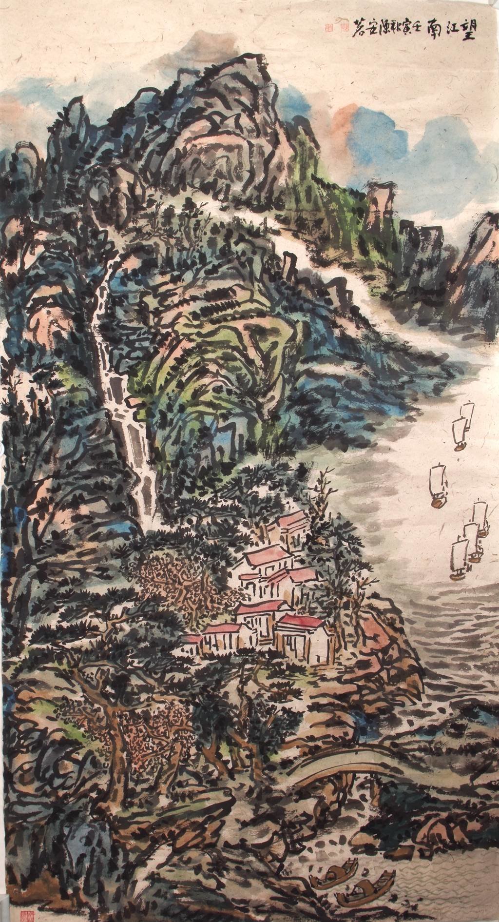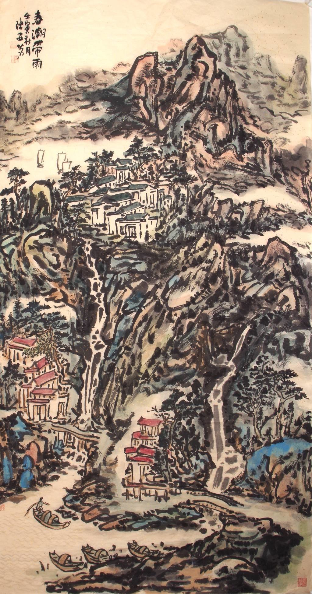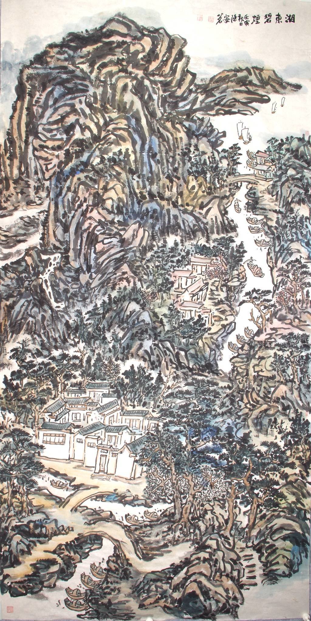 作画不能离开透视。古法,石分三面、树分四枝、远水无波、远人无目,又仰画飞檐等等,即是透视。所以,国画山水不是不讲透视,就是不讲到底,也不强调透视。像投影法用焦点透视,是几根线拉到一个焦点上。中国的长条立幅画怎样拉法?至于长卷就更难拉了。这样讲透视,就讲死了。但也不能违背焦点透视的规律,一根线应该向上的反而向下了,近距离应该大的反而小了,就不对。一根线在倾斜的程度上可以变动,在规律上却不能违背。违背了这些规律,看上去就不舒服,就别扭。西画强调光,其光源是从单一的方向来的,所以是统一的。中国画不是不要光,但一般不强调光,而且其光源不一定要求统一,可以从多方面来。同样情形,中国画的透视不是焦点透视,而是采取散点透视的规律;其消失点也不一定要求在同一根视平线上,而且一般部位很高,往往在画幅的顶端甚至超出顶端之上,就是采取俯视的角度。所以,中国画的光照也采取自上而下。所说石分上左右三面,上面是受光处,其光源就是自上而下或偏于上,很少是偏于下或绝对的左或右。