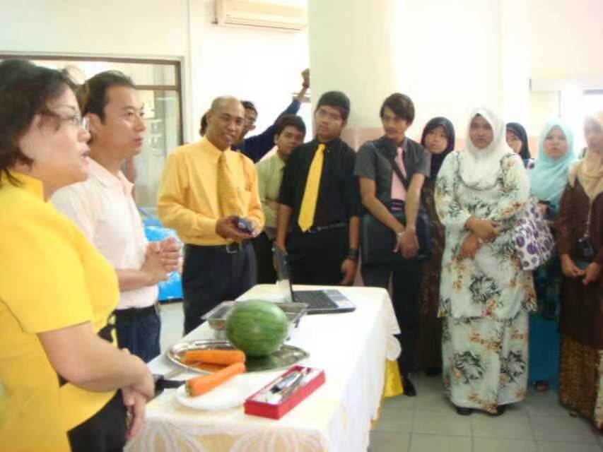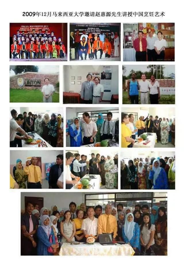 2009年12月,马来西亚大学邀请赵慧源大师讲授中国烹饪艺术。赵慧源大师与马来西亚大学烹饪学界同仁进行了深入友好的学术交流,并给学生表演了西瓜食雕艺术。在大家的视线下,赵慧源大师聚精会神地做西瓜食雕,不一会儿,一朵红白相间的美丽“牡丹”绽放在大家面前。现场师生都为赵慧源大师的食雕艺术折服,大家现场合影留念。