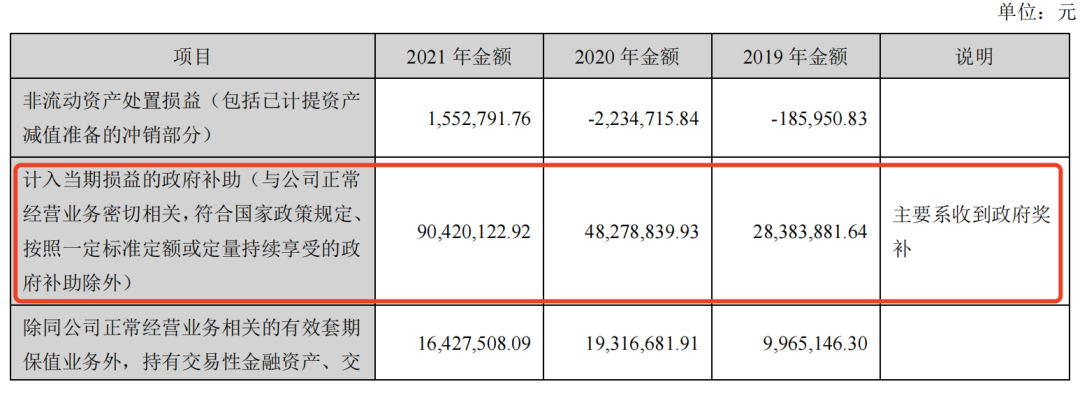 2018-2021年,公司计入当期损益的政府补助分别为5333.14万元、2838.39万元、4827.88万元、9042.01万元,分别占当期净利润的17.55%、11.89%、16.02%、21.99%。