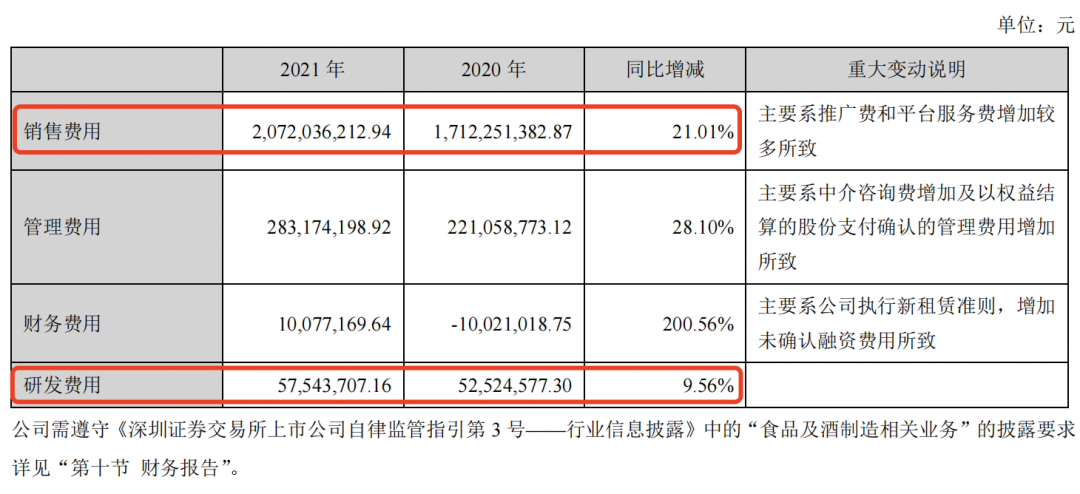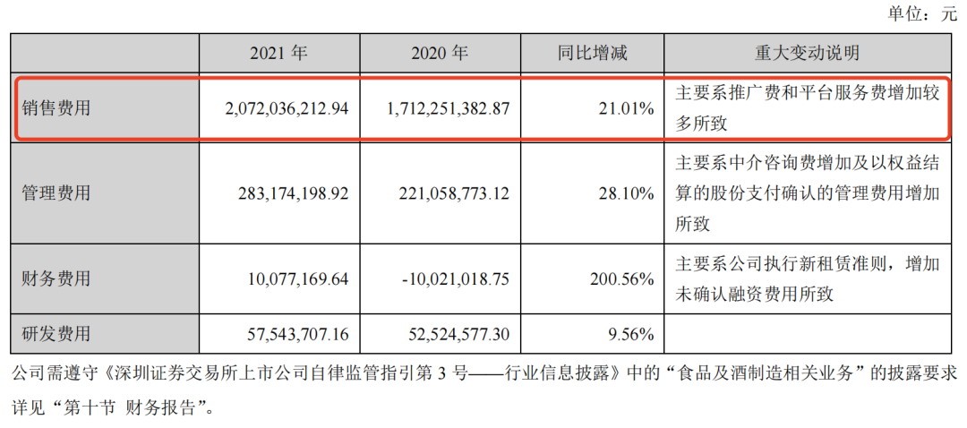 2016年至2021年间,三只松鼠销售费用分别为9.178亿、10.75亿、14.61亿、22.98亿、17.12亿元、20.72亿元,占营收比例为20.75%、19.36%、20.87%、22.59%、17.48%、21.21%。