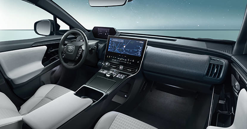 车内的造型虽然也和以往的燃油丰田不一样,但是依然能看到一些影子。比如中控屏的尺寸达到了12.3英寸(低配是8英寸),和中控台融合在一起还挺高级的。加上独立的液晶仪表,全新的方向盘等等,看起来确实有点新意。