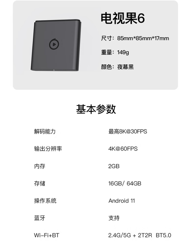 此外,它还支持 2.4/5GHz 双频 WiFi + 双频天线,支持蓝牙 5.0,提供 HDMI 2.0 和 USB 接口,无网口,支持 AirPlay、DLNA、华为 CAST+Miracast 投屏协议,提供腾讯、爱奇艺、优酷、芒果、B站、银河等内容源。