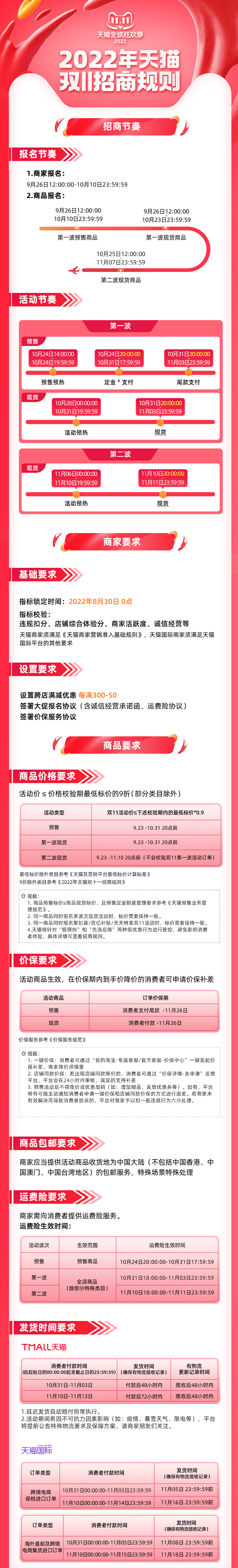 招商规则:商家报名时间为2022年9月26日-2022年10月10日。本次天猫双11的优惠力度为“跨店满减优惠每满300-50”,商品价格要求为“活动价小于或等于价格校验期最低标价的9折(部分类目除外)”。