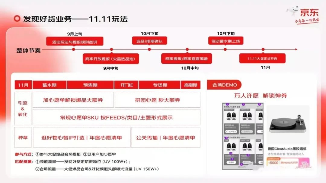 “发现好货”业务也在11.11期间进行了全新升级,“加心愿单解锁爆品大额券”和“拼团心愿秒大额券”两大玩法持续吸引用户;