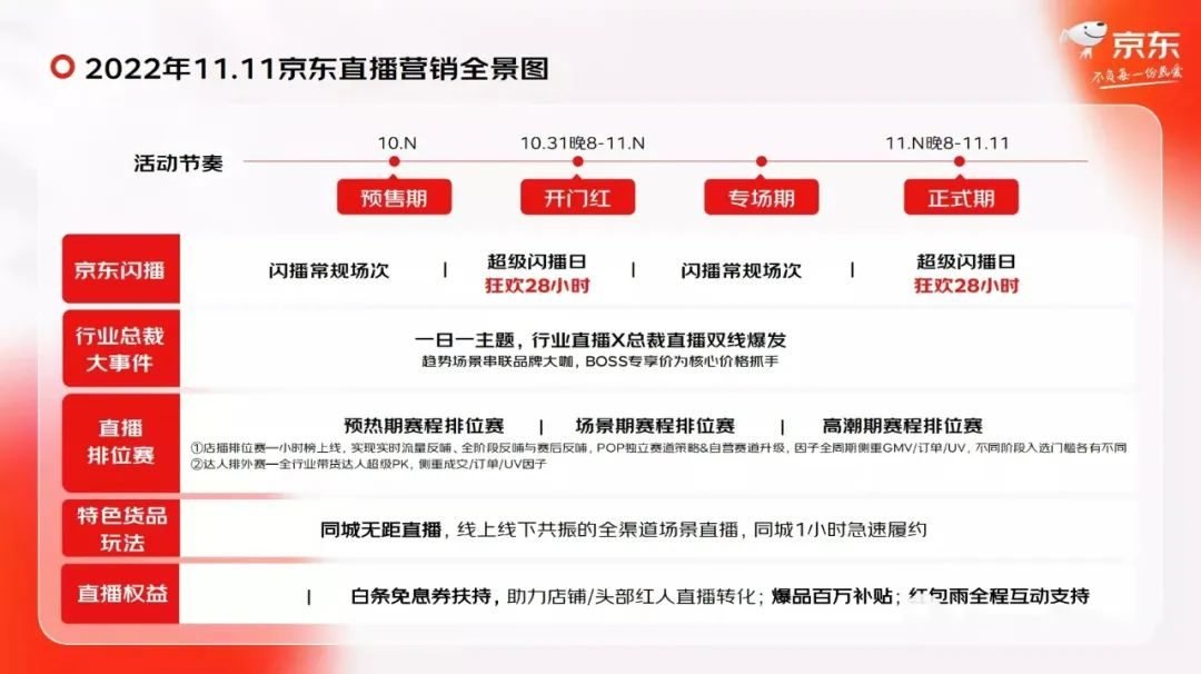 活动时间:今年京东11.11一共分为5个时期:种草期、预售|预热期、开门红、品类场景期、高峰期。新增了种草期,10月份开启种草期,10月下旬进入预售预热期;同时今年开门红28小时将上线分时段玩法。在内容运营上新增了短视频排位赛、店播达播排位赛。