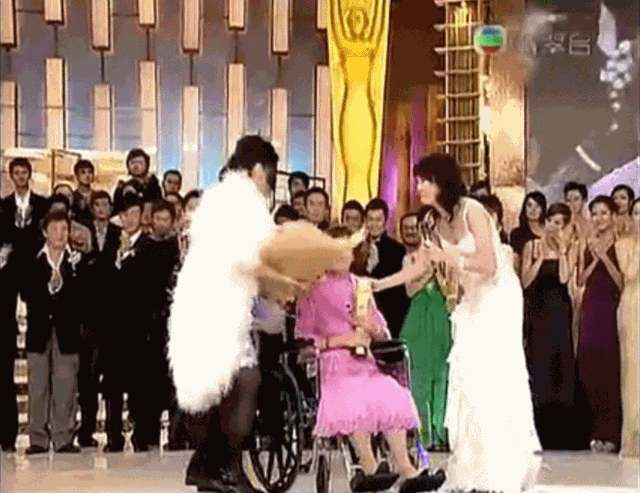 汪明荃向她献花时,她表情僵硬,可是坐在轮椅上已经由不得她。