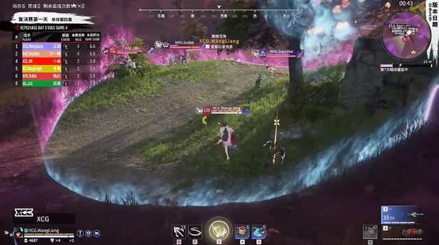WangLiang此刻已经有4个击败分了,并不想投入到第一战场去,所以他选择了与其他选手拉开距离,并利用喷火筒偷袭别人。NPG丶DuBai丝血被迫拔刀,NAD丶Dao1Hui趁机起飞,WangLiang是最晚拔刀的,并趁乱妖刀斩上天。