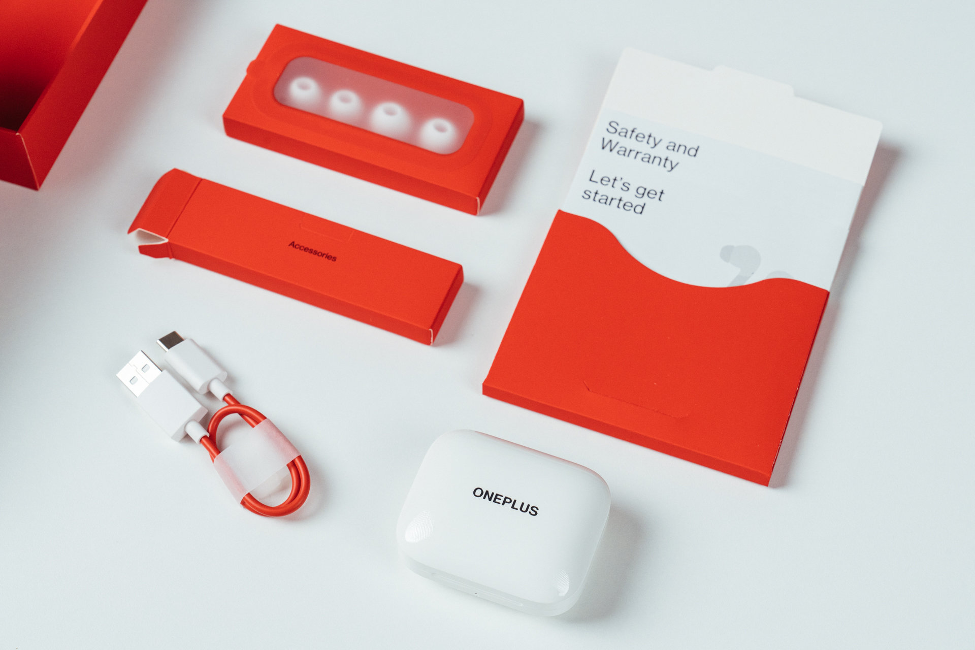 OnePlus Buds Pro的包装设计,依然是一加的红白设计风格,里面出了耳机外,还附赠了2对不同尺寸的软硅胶耳塞,满足大多数人的佩戴需求。