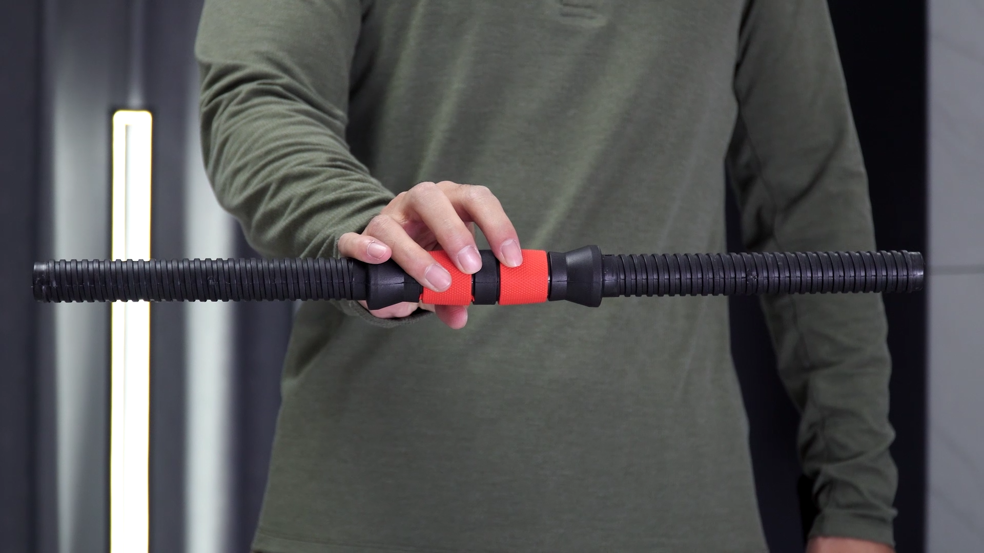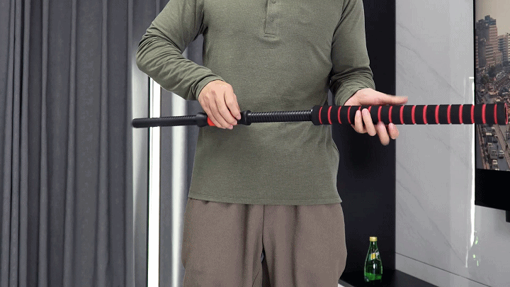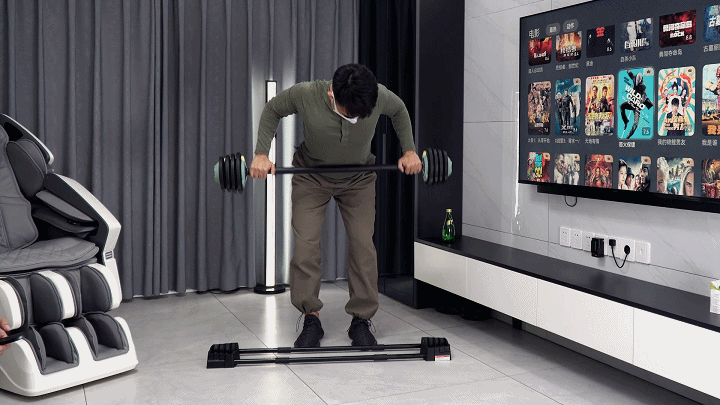 切换到杠铃可以用来锻炼大肌群,杠铃杆的长度和握持的手感都不错。有一说一,这个杠铃的重量对于我来说有些偏轻,如果有条件的话,建议再加一根弹力带,效果会更好。