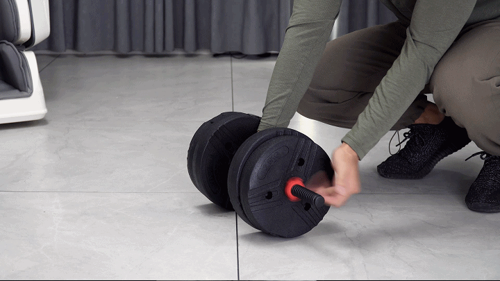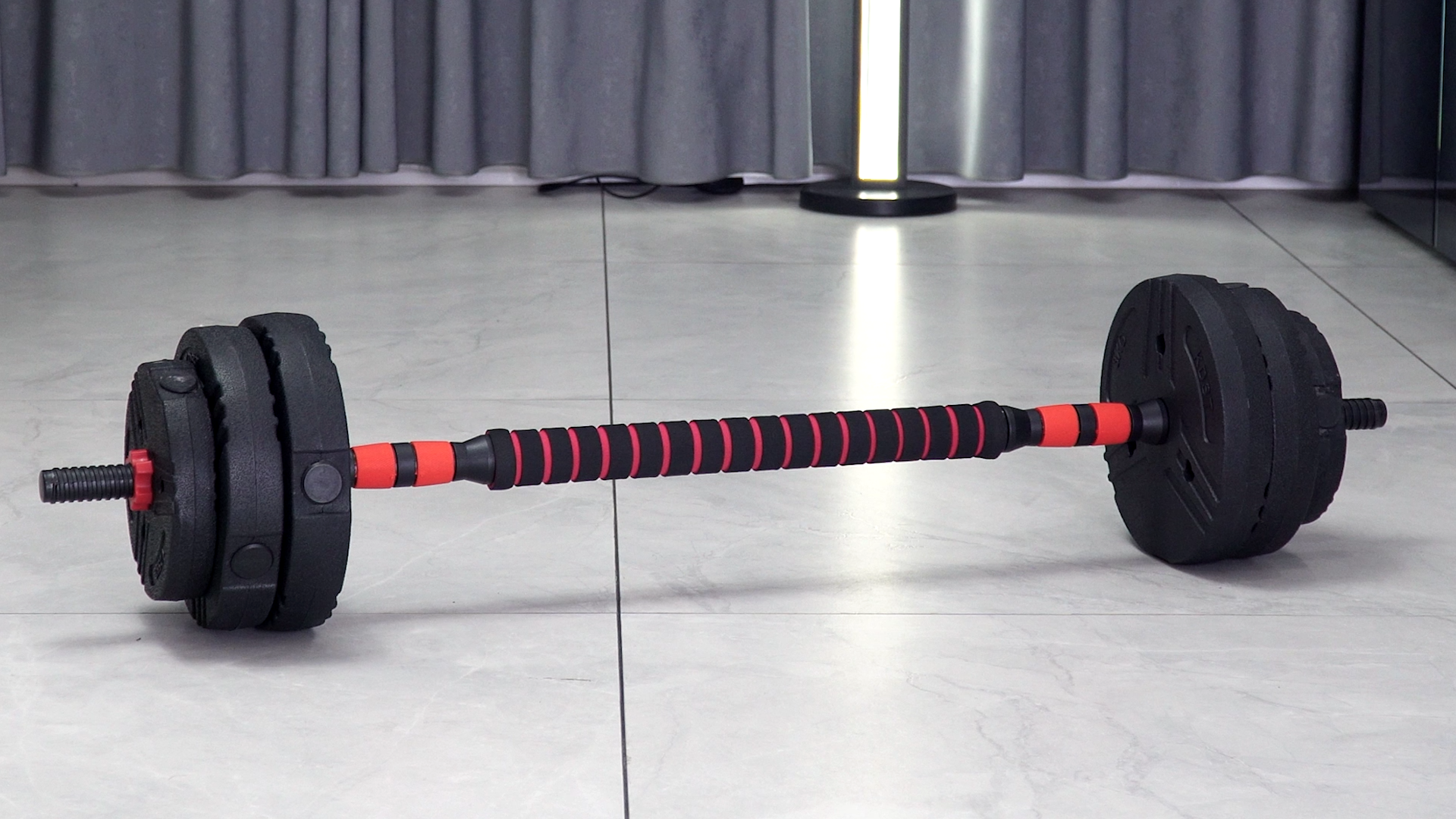 其实之前我家里有一套哑铃,就是很传统的那种二合一哑铃,把哑铃片卸掉之后,两个哑铃杆拼在一起又能组合成一个杠铃杆。