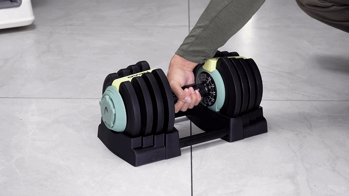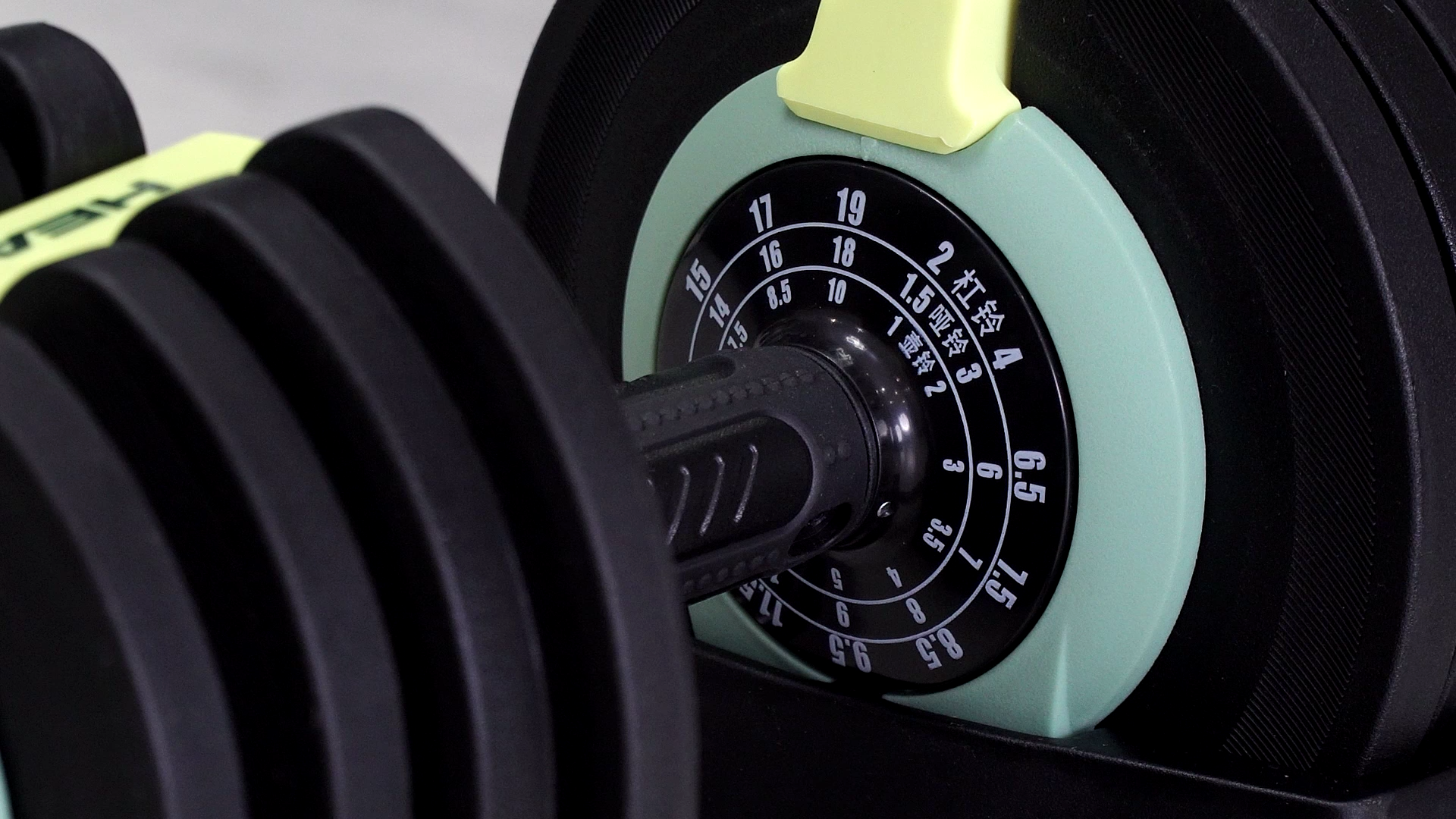 再来看海德的这套可调节哑铃是怎么操作的,它的底座上带有数字标志,手柄是可以旋转的,转到哪个数字就代表当前哑铃是多少公斤。