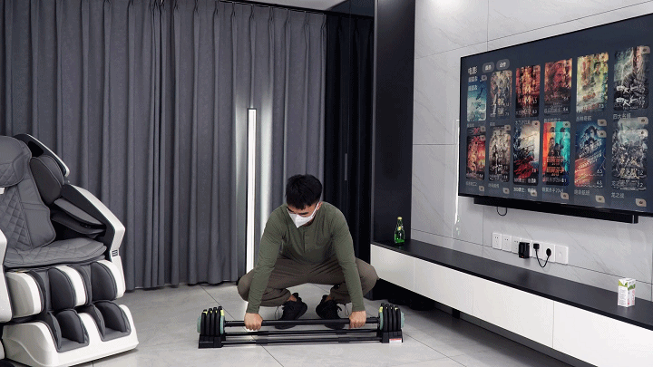 杠铃杆组装好之后直接放回到底座,还是和刚刚一样,想要多重的重量直接旋转手柄就可以实现,依旧是12个档位。